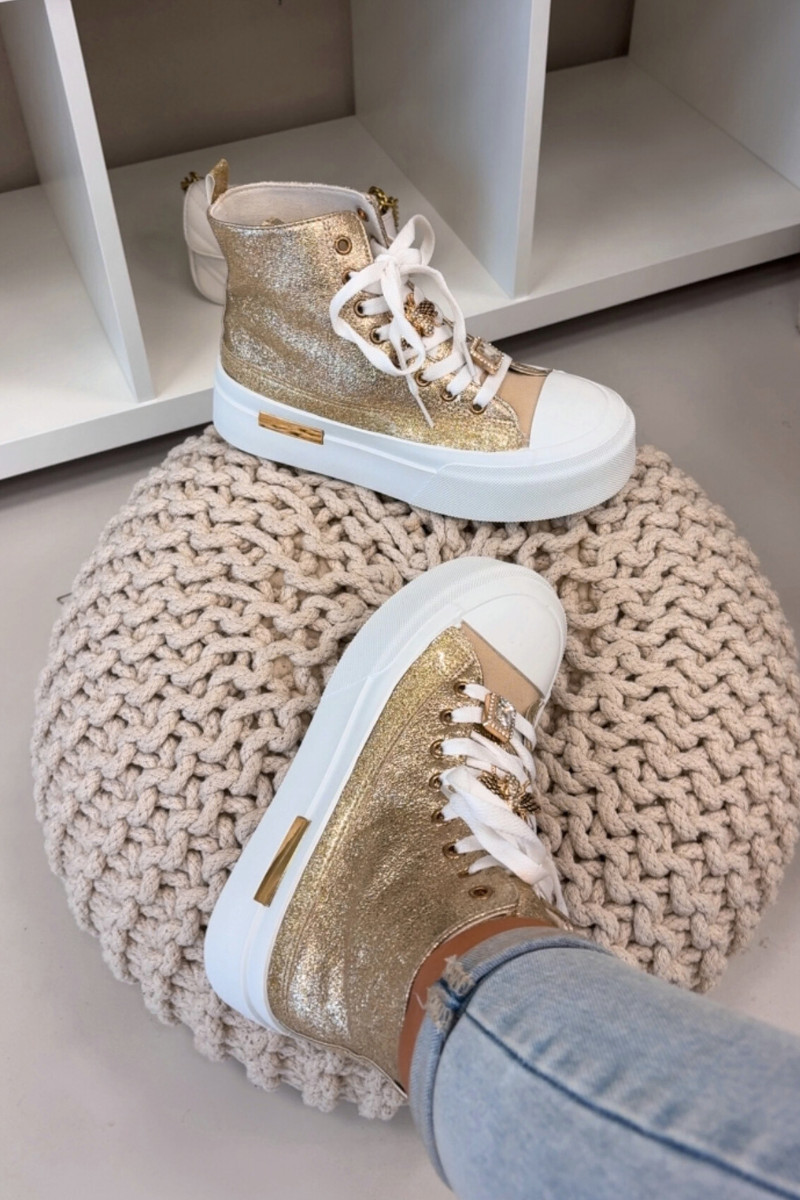 Dámské tenisky na masivní platformě jsou módní volbou pro milovnice výrazného stylu. Tlustá podrážka dodává obuvi moderní charakter a zajišťuje pohodlí při nošení, zatímco zlatý prvek je atraktivní akcent. Šněrovací model zaručuje dobré přizpůsobení noze a ozdobné přívěsky dodávají celku originalitu a módní výraz. Tyto tenisky se skvěle hodí pro každodenní styling. Při výběru velikosti se řiďte tabulkou velikostí.