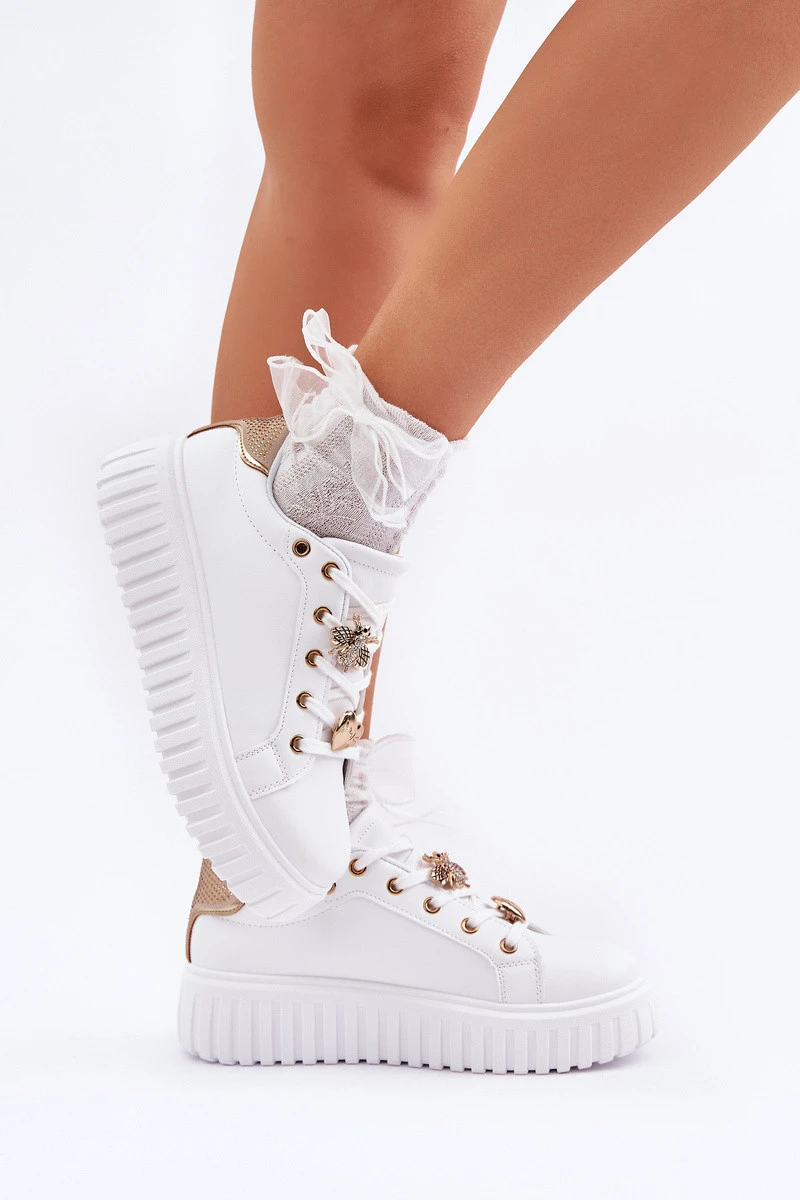 Dámské tenisky vyrobené z ekologické kůže. Usazené na platformě, která dodává jemnou výšku, a zároveň zajišťuje komfort při chůzi. Klasické šněrování umožňuje dokonalé přizpůsobení noze. Výjimečnou výhodou tohoto modelu jsou roztomilé přívěsky, které dodávají originalitu a dívčí kouzlo. Tento model se skvěle hodí jak pro každodenní, tak pro více casualové stylizace, a je stylovým doplňkem každého šatníku. Při výběru velikosti se řiďte tabulkou velikostí.