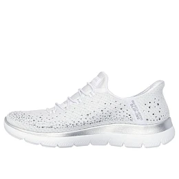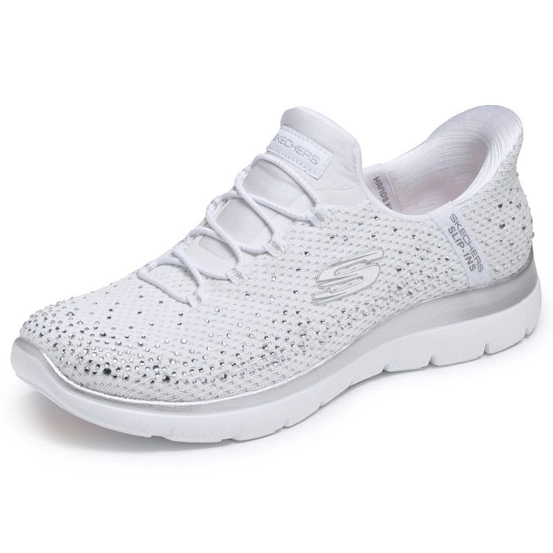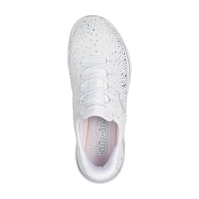 Dodejte svým krokům šmrnc s pohodlnými botami Skechers Slip-ins®: Summits - Brilliant Shine. Tyto veganské boty navržené s naším exkluzivním systémem Heel Pillow™ mají svršek ze síťoviny zdobený krystaly, elastické tkaničky a pohodlnou, odpruženou stélku Skechers Air-Cooled Memory Foam™.
