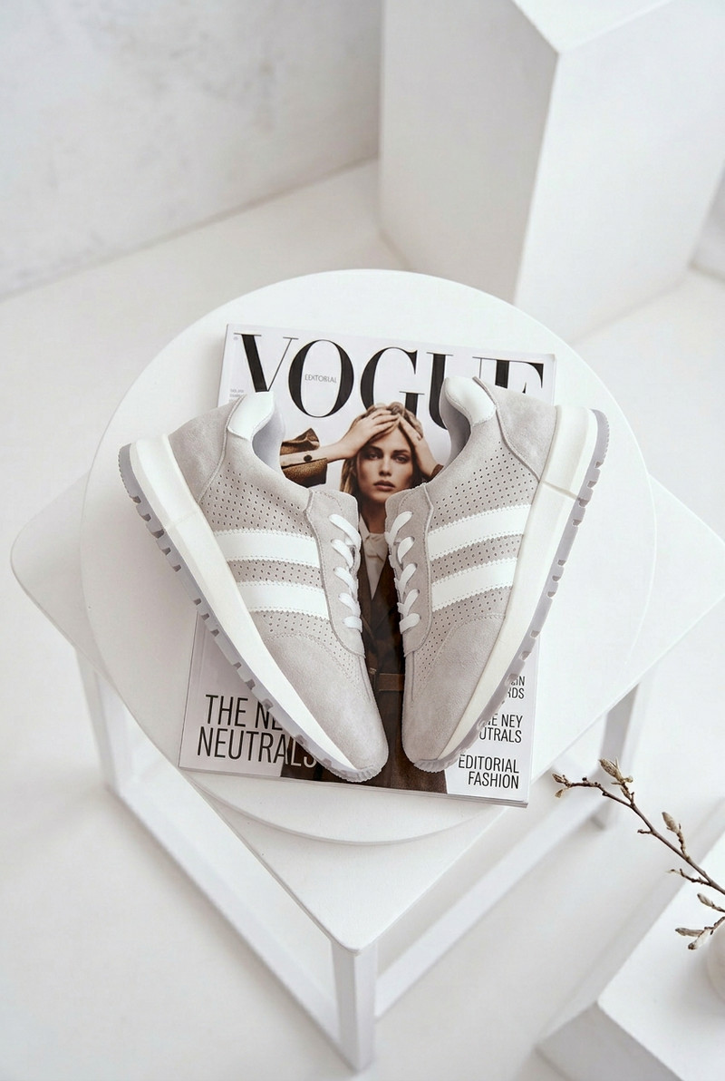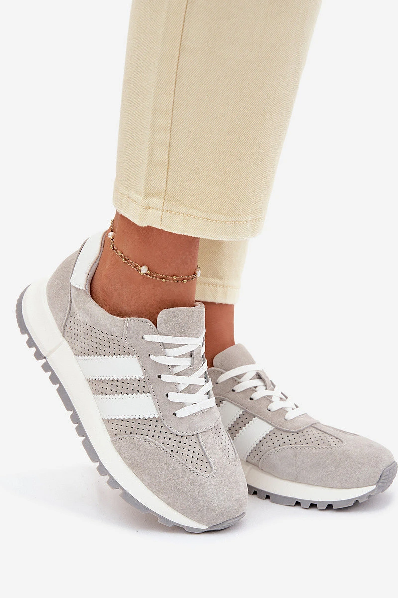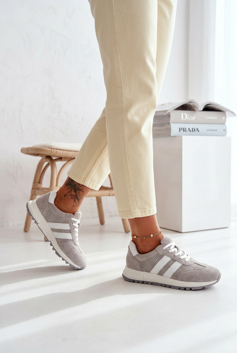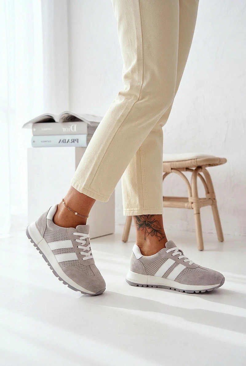 Dámské tenisky vyrobené z přírodního semiše jsou spojení pohodlí a nadčasového stylu. Dva pásky umístěné po stranách zdůrazňují jejich módní, sportovní charakter. Vnitřek je vybaven měkkou koženou vložkou, která zajišťuje pohodlí i při dlouhodobém nošení. Ideální volba na každý den – tenisky skvěle ladí jak s džínami, tak s kalhotami z materiálu, vytvářejíc stylové kombinace. Při výběru velikosti se řiďte tabulkou velikostí.