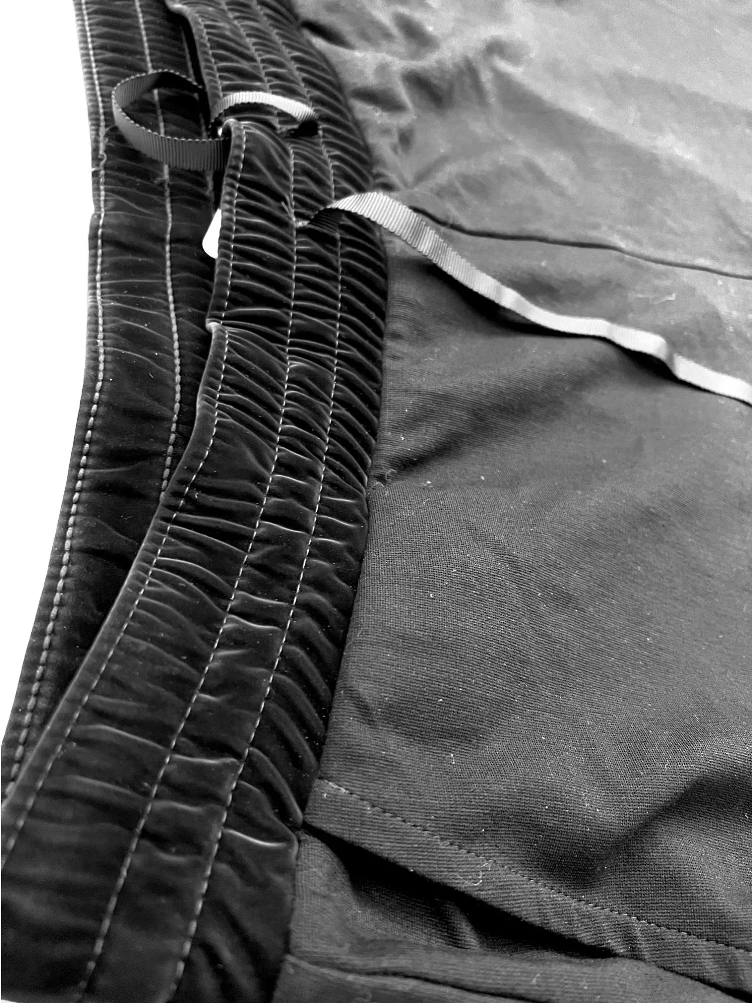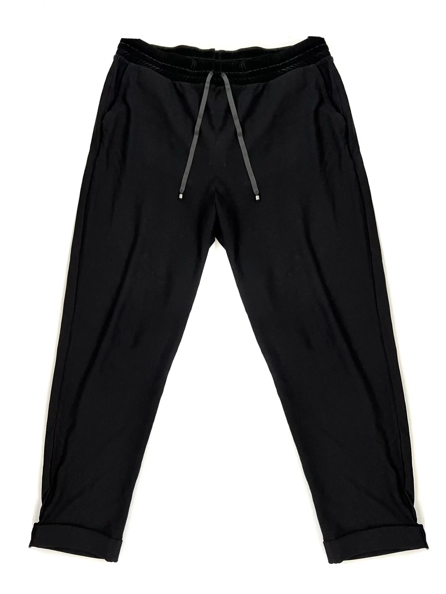 Dámské teplákové kalhoty na třikrát prošitou gumu a zavazování v pase. U gumy je látka ve stylu semiše. Spodní část kalhot je prošitá.