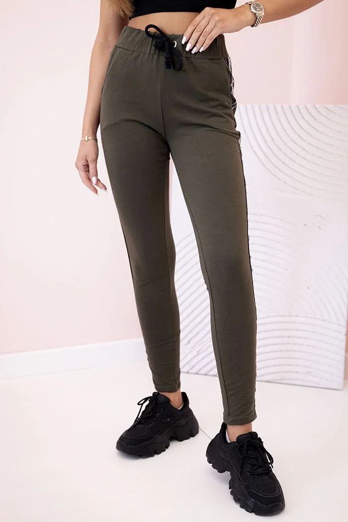 Dámské teplákové kalhoty s lampasem a šňůrkou v pase khaki