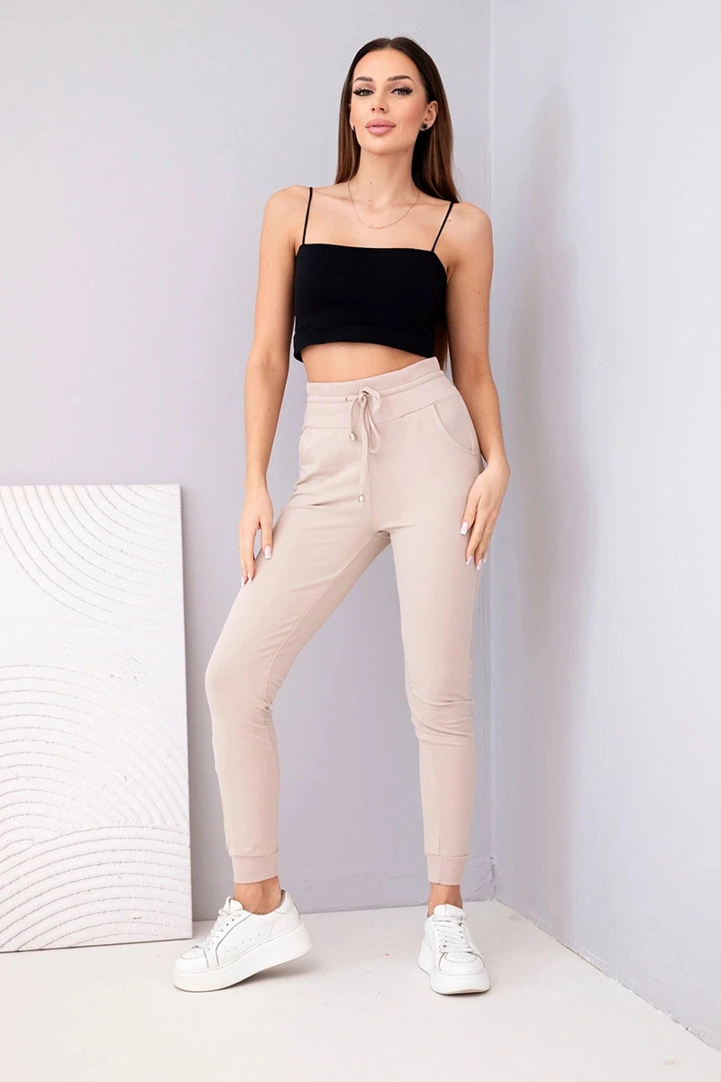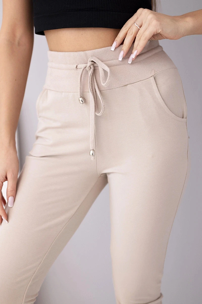 Dámské teplákové kalhoty s vysokým pasem a šňůrkou béžové