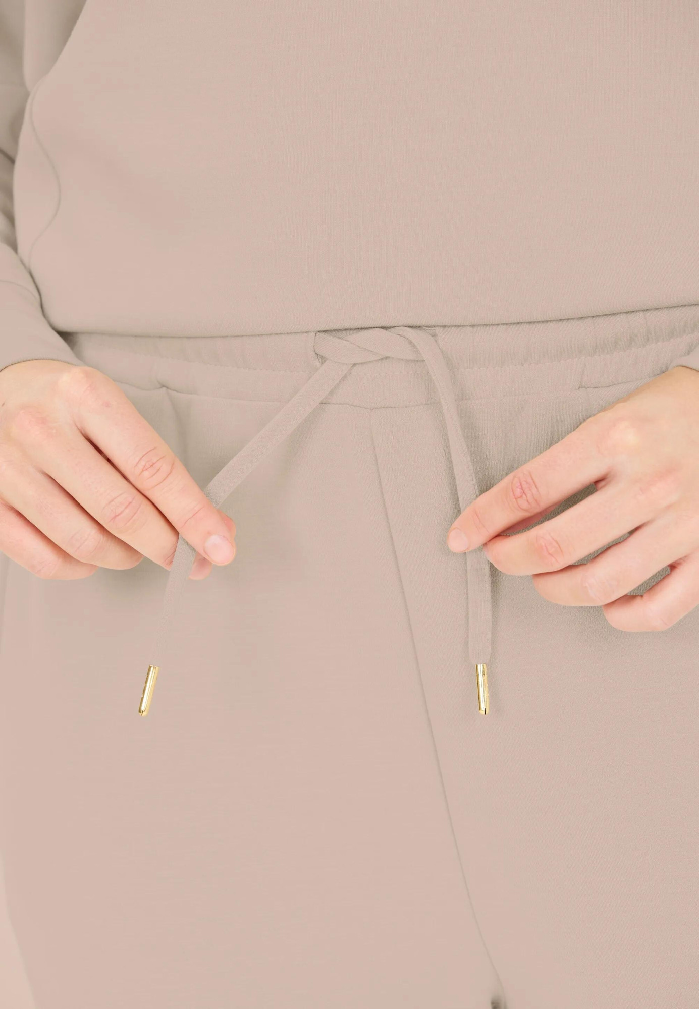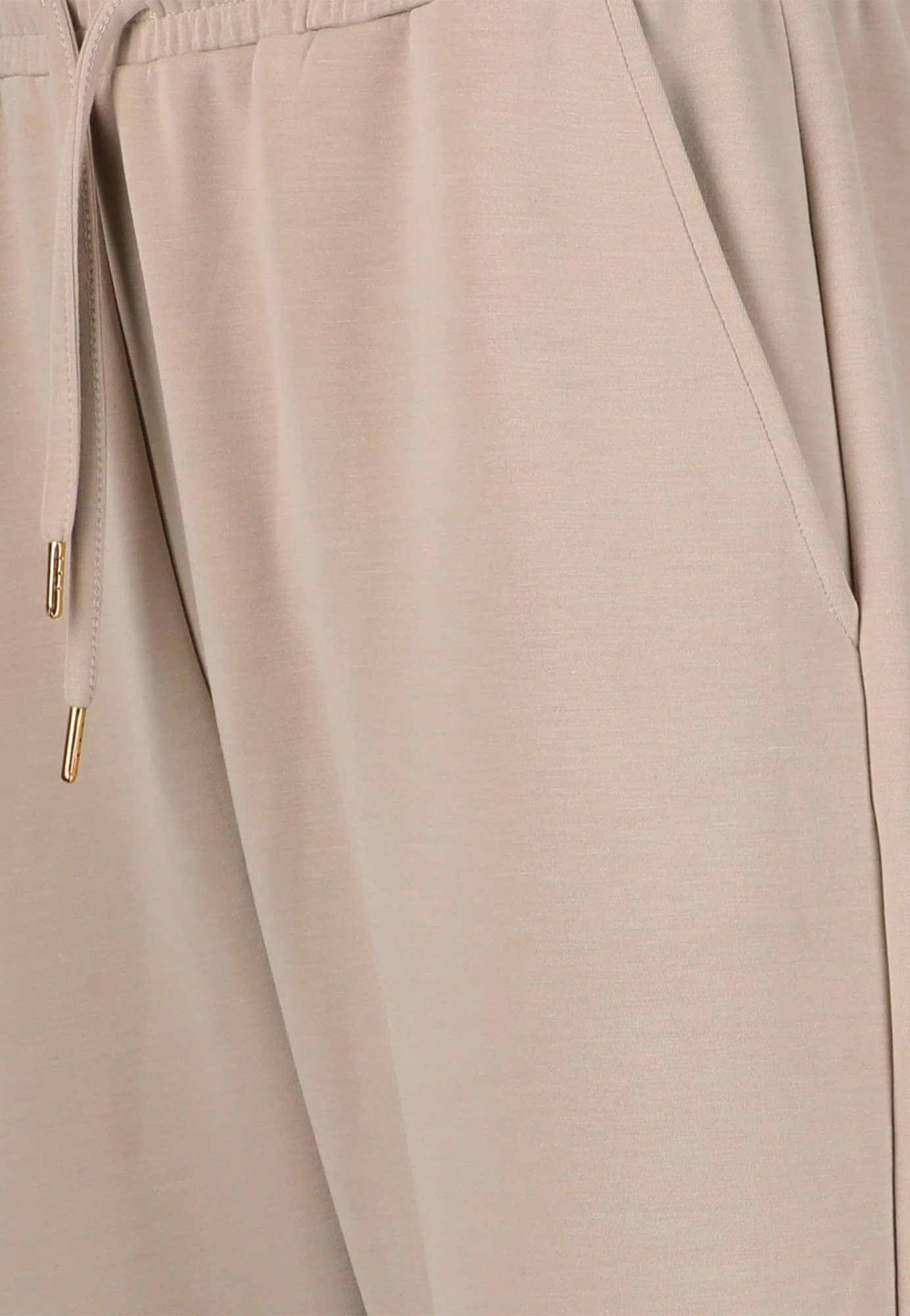 Elastický pas se stahovací šňůrkou umožňuje přizpůsobení obvodu pasu, zatímco zúžený střih nohavic dodává moderní siluetu.