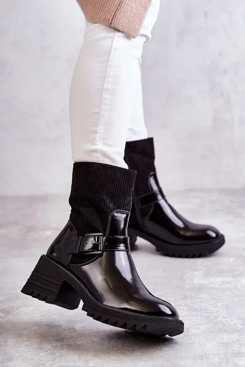 Jedinečné dámské kozačky jsou vyrobeny z kombinace eko kůže a textilního materiálu připomínajícího manšestr. Na boku je ozdobná přezka s nastavitelným páskem. Boty mají zateplení ve formě deky na boty. Nasazené na masivním podpatku a platformě s nepravidelným nášlapem. Podpatek je dodatečně vyztužený. Zapínání na zip na boční straně svršku. Při výběru velikosti použijte tabulku velikostí.