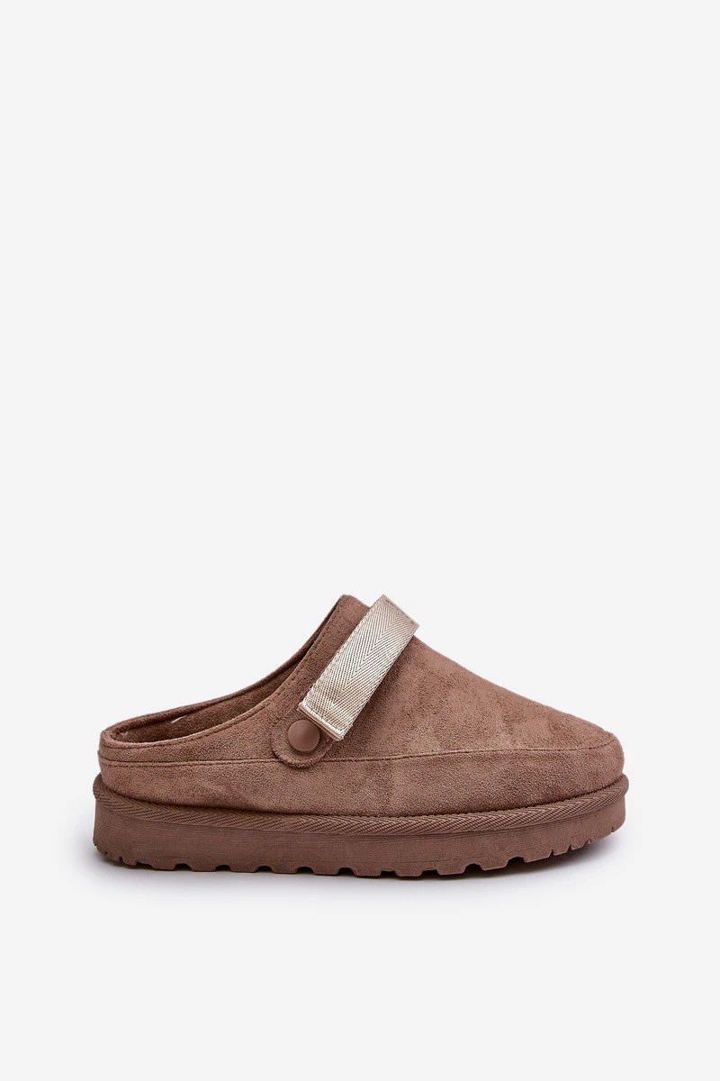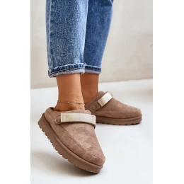 Dámské pantofle vyrobené z eko semiše. Umístěny na platformě. Vnitřek je zateplen příjemným kožíškem, což zajišťuje komfort v chladnějších dnech. Navíc mají pohyblivý pásek na suchý zip, který stabilizuje patu a umožňuje dokonalé přizpůsobení. Ideální na každodenní nošení, kombinují styl s funkčností. Při výběru velikosti se řiďte tabulkou velikostí.