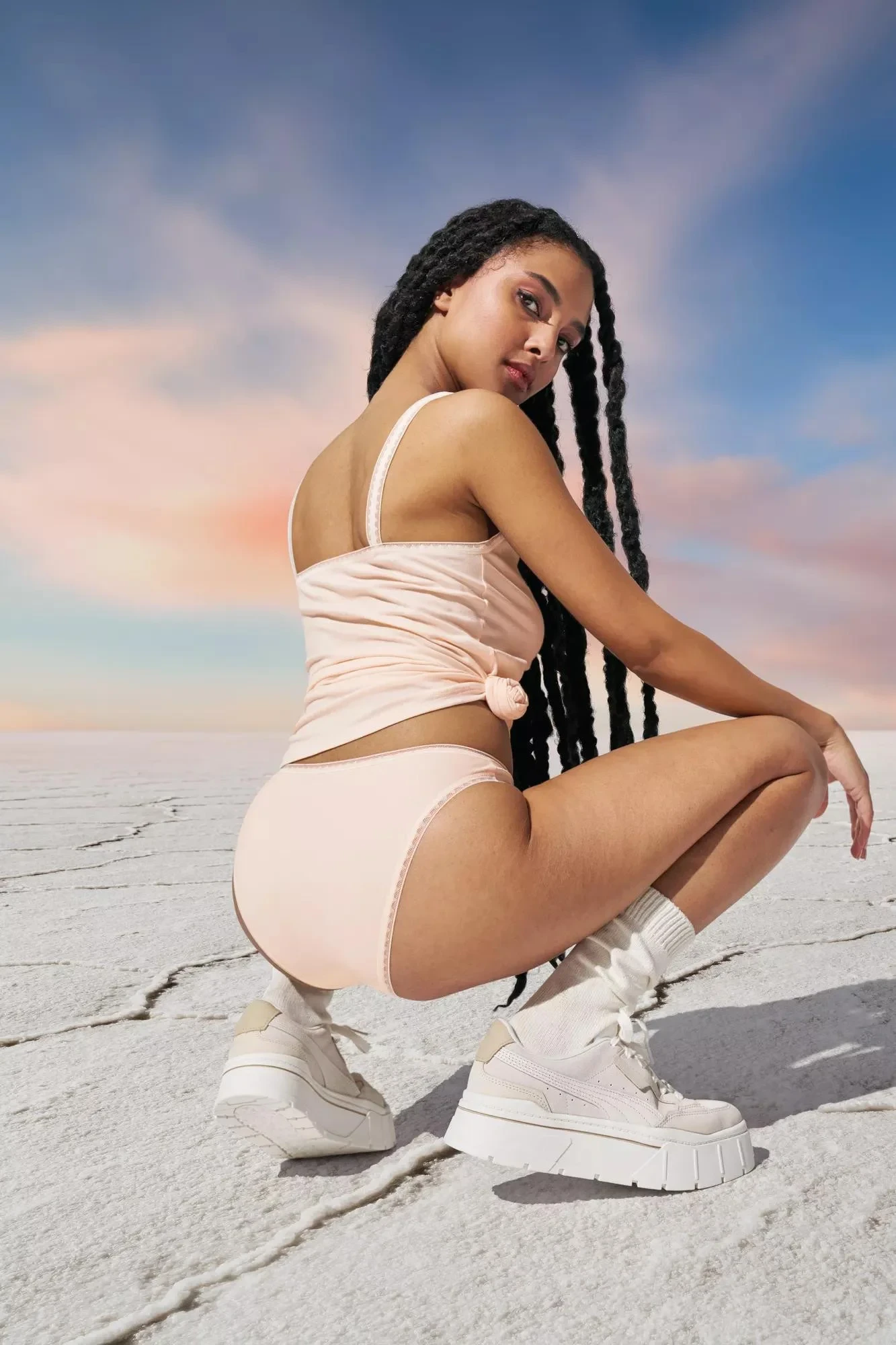 Modelka má na sobě tílko se špagetovými ramínky ve velikosti S