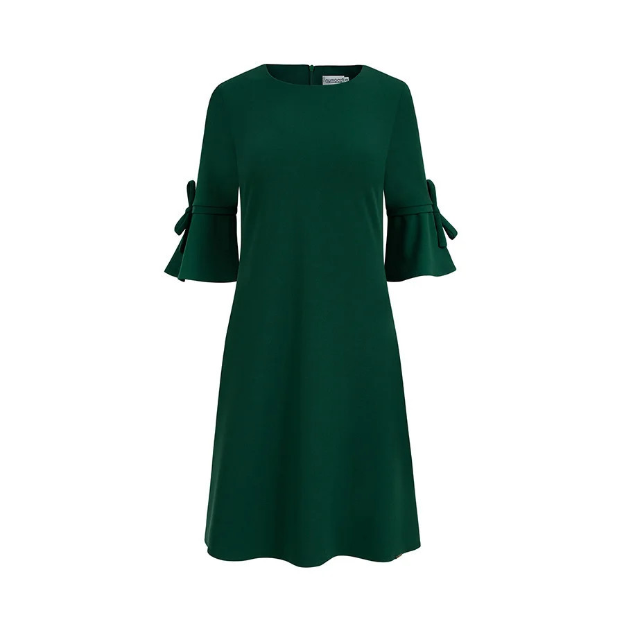 Neva - to jsou tmavě zelené dámské trapézové šaty s rozšířenými rukávy a mašličkami.