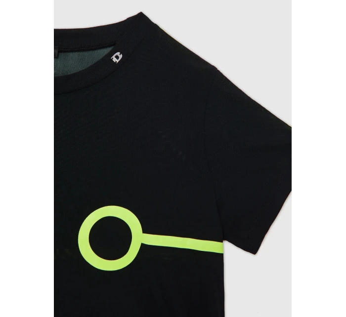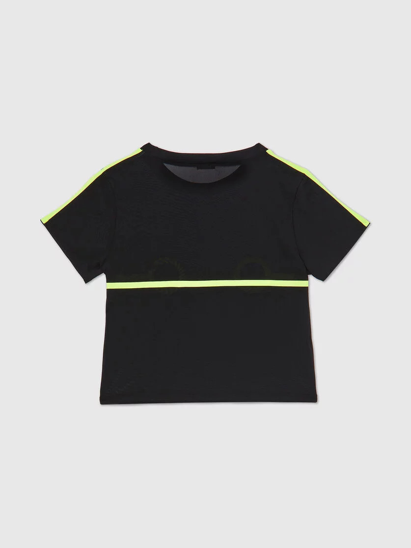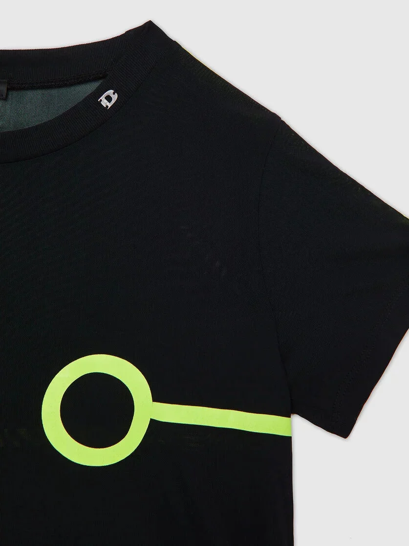 Měkké tričko ze strečové síťoviny s fluorescenčními obrysy. Kulatý výstřih je zvýrazněn kovovým logem D.
