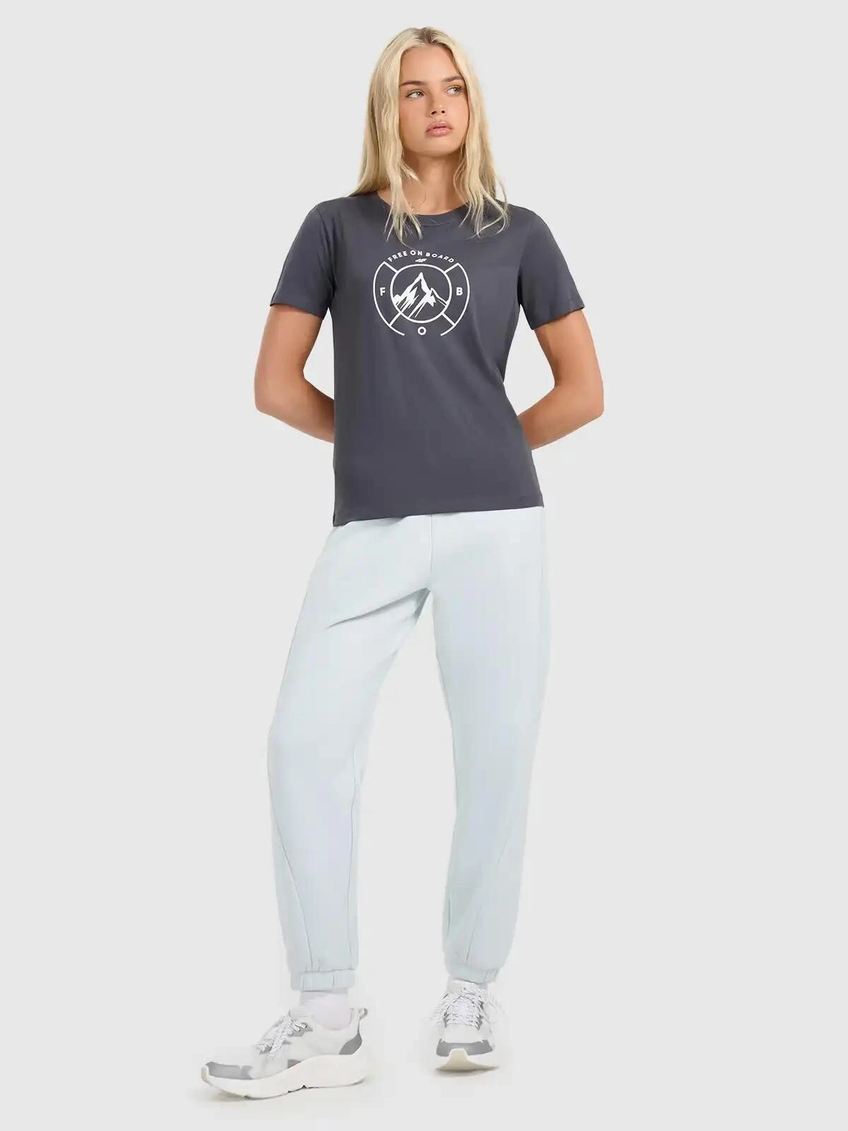 Na přední straně je výrazný potisk s motivem hory a nápisem „Free On Board (FOB)“, který podtrhuje outdoorový a sportovní charakter tohoto modelu.