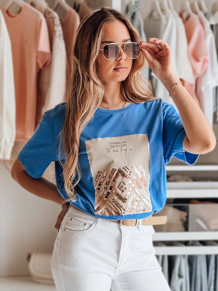 Poutavé tričko CENTIA je základem šatníku pro každou ženu, která ocení jednoduchost s nádechem extravagance. Flitrový potisk se jemně třpytí při každém pohybu a dodává jemnou dynamiku i těm nejjednodušším soupravám. Tričko CENTIA je ideální pro kombinaci s džínami nebo elegantními kalhotami a poskytuje všestrannost a styl, který se uplatní kdekoli a kdykoli.