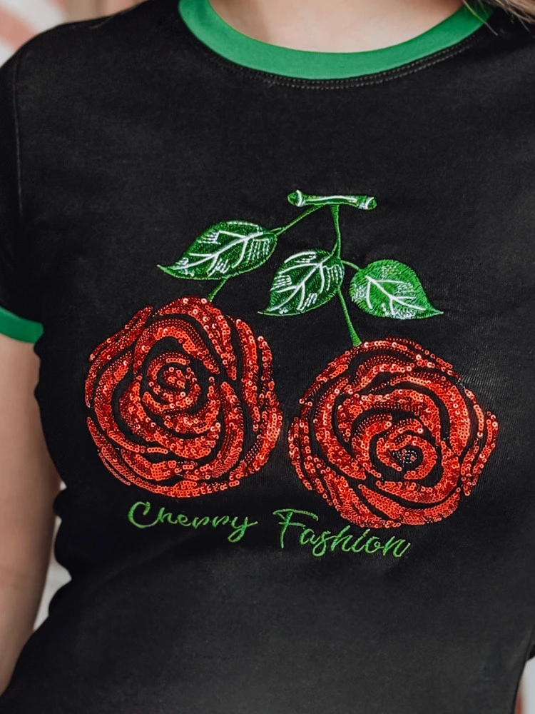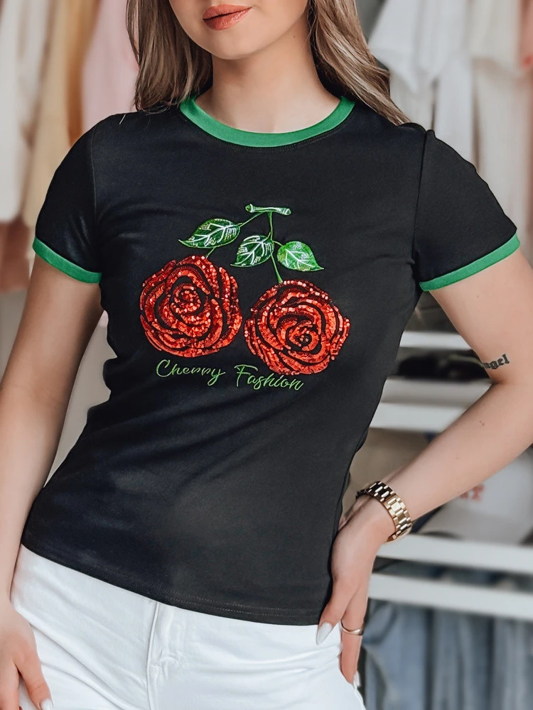 T-shirt damski o dopasowanym kroju z motywem róż ułożonych w kształt wiśni. Cekiny na nadruku subtelnie odbijają światło, nadając całości wyjątkowy charakter oraz efektu 3D. Wykończenie przy rękawkach i dekolcie podkreśla świeży look. Koszulka doskonale sprawdzi się w wiosennych, casualowych outfitach.