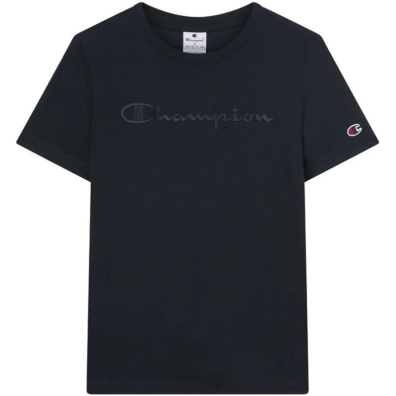 Dámské tričko Champion SS Tee černé 118382 KK001 Dámské tričko Champion je ideální tričko pro každodenní nošení, má přizpůsobený střih, kulatý výstřih, měkký materiál, velké vyšívané logo na hrudi a decentní nášivku na rukávu.