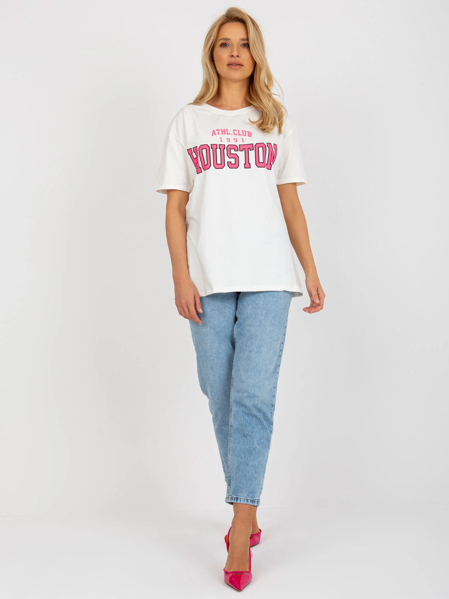 Volné dámské tričko s potiskem v barvě ecru .