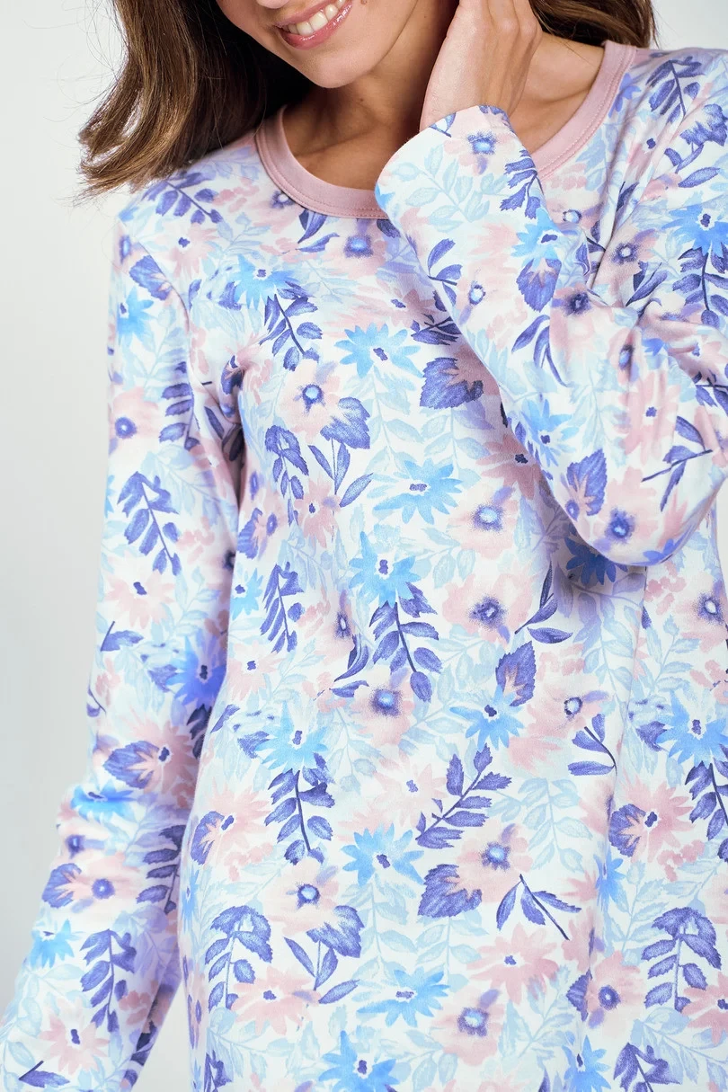 Dámská košile s dlouhými rukávy z hřejivého vzorovaného bavlněného interlooku. Kulatý výstřih. Délka ke kolenům.