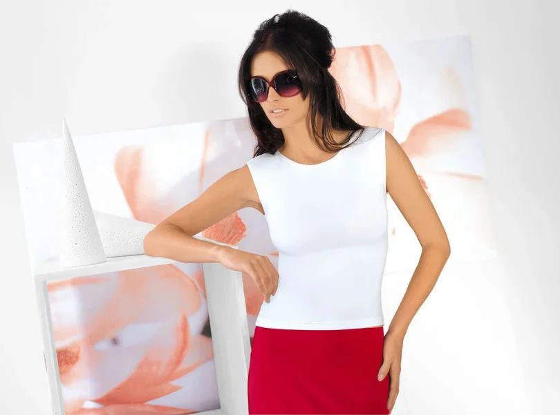Model má široká ramínka je celý hladký. Tričko je k dostání v mnoha barvách.