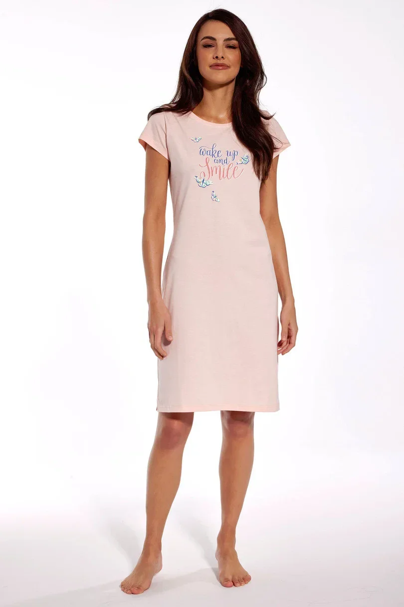 Dámská košile s krátkým rukávem, ušitá z měkké jednotné bavlny. Barevný potisk na úrovni hrudníku. Kulatý výstřih, délka košile před kolena. Baleno v krabici.