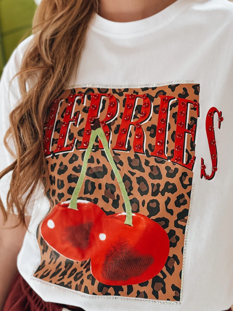 Pohodlné dámské tričko s výrazným potiskem dvou červených třešní na pozadí leopardího vzoru. Model upoutá pozornost velkým ozdobným nápisem s třpytivými zirkony a jemnými třpytkami kolem potisku, které tričku dodávají 3D efekt. Volný oversize střih s krátkými rukávy a klasickým výstřihem je ideální pro ležérní styling.