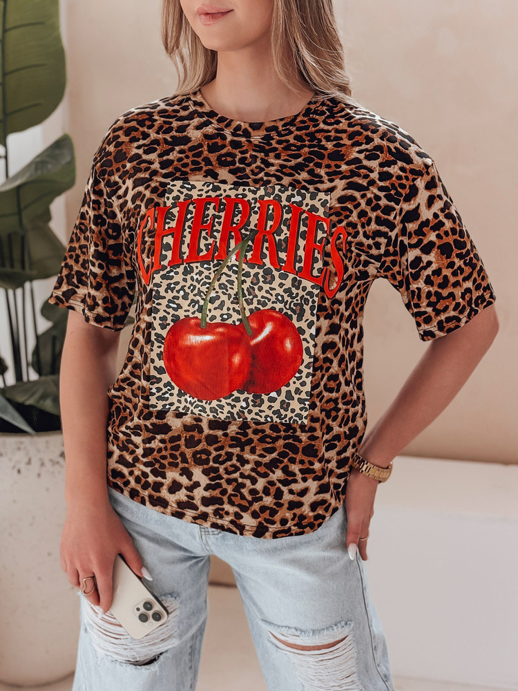 T-shirt damski oversize o wyrazistym charakterze dzięki motywowi panterki, który pokrywa całą powierzchnię materiału. Na froncie efektowny nadruk przedstawiający czerwone wiśnie i duży napis "CHERRIES", które przyciągają wzrok, jak i nadają stylizacji energii. Model posiada okrągły dekolt oraz krótkie rękawy, co czyni go idealnym wyborem na wiosenne i letnie dni. Doskonale łączy się z jeansami lub szortami, tworząc modny, casualowy look z pazurem.