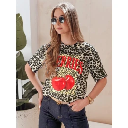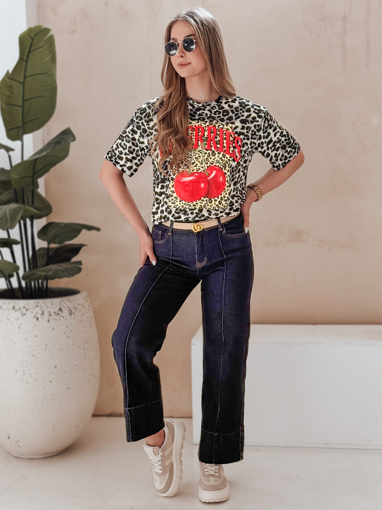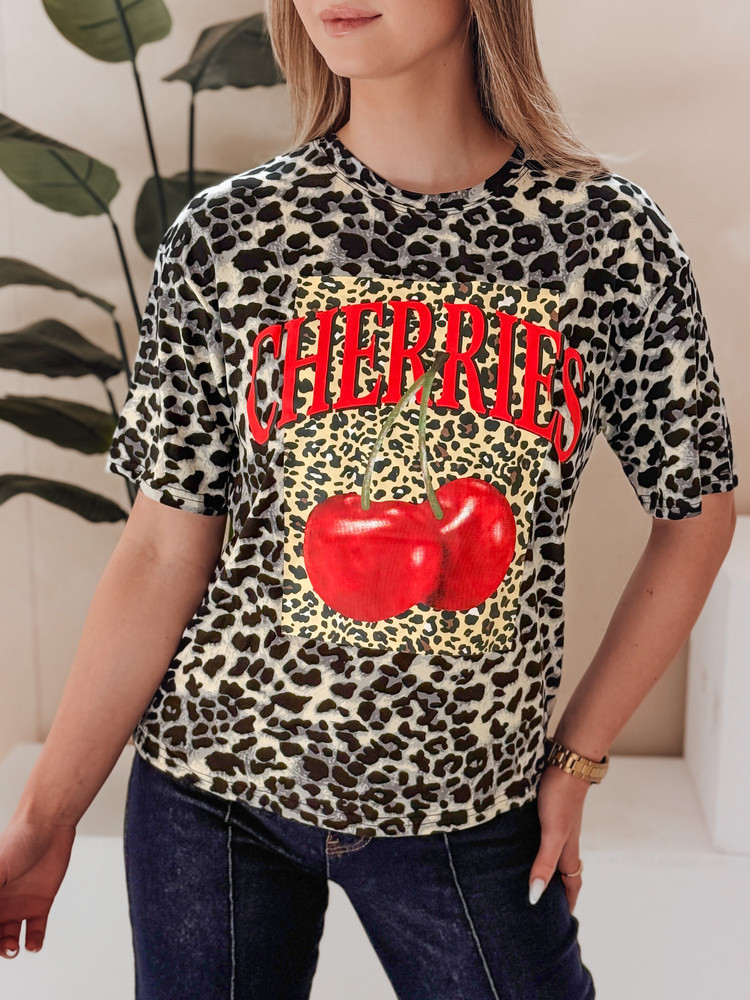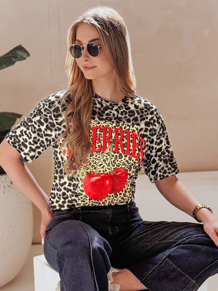 T-shirt damski oversize o wyrazistym charakterze dzięki motywowi panterki, który pokrywa całą powierzchnię materiału. Na froncie efektowny nadruk przedstawiający czerwone wiśnie i duży napis "CHERRIES", które przyciągają wzrok, jak i nadają stylizacji energii. Model posiada okrągły dekolt oraz krótkie rękawy, co czyni go idealnym wyborem na wiosenne i letnie dni. Doskonale łączy się z jeansami lub szortami, tworząc modny, casualowy look z pazurem.