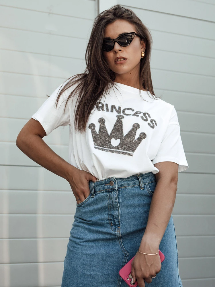 Dámské tričko PRINCY je synonymem moderního stylu s lesklým akcentem, který přitahuje pozornost a dodává tričku zvláštní nádech. Klasický střih je ideální pro každou příležitost a zajišťuje jeho pohodlné nošení. Toto tričko nesmí chybět v šatníku žádné ženy, která se chce cítit jako skutečná princezna.