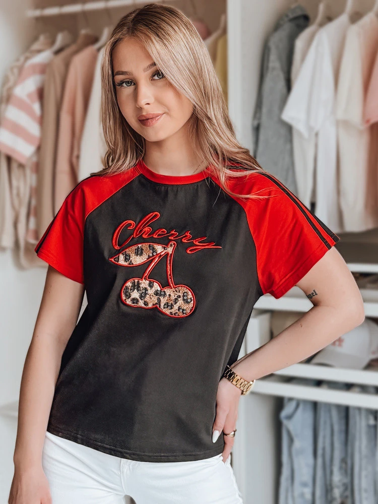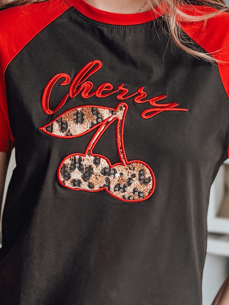 Dámské tričko s krátkým rukávem sportovního charakteru, které se vyznačuje 3D efektem s potiskem třešní a lesklými flitry. Kontrastní rukávy zdobené dvojitými proužky mu dodávají dynamický styl. Kulatý výstřih a volnější střih poskytují pohodlí a módní vzhled. Ideální pro ležérní styling v teplejších dnech jarní sezóny.