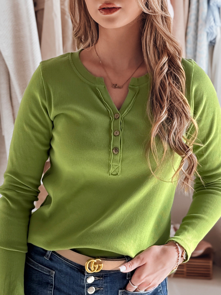 Dámský dlouhý rukáv s ozdobným zapínáním na knoflíky ve výstřihu. Elastický materiál zvýrazňuje postavu a zároveň zaručuje každodenní pohodlí. Univerzální velikost padne od XS do L. Ideální volba k džínům, sukním nebo látkovým kalhotám. Jednoduchý, ale stylový střih je vhodný pro každou příležitost.