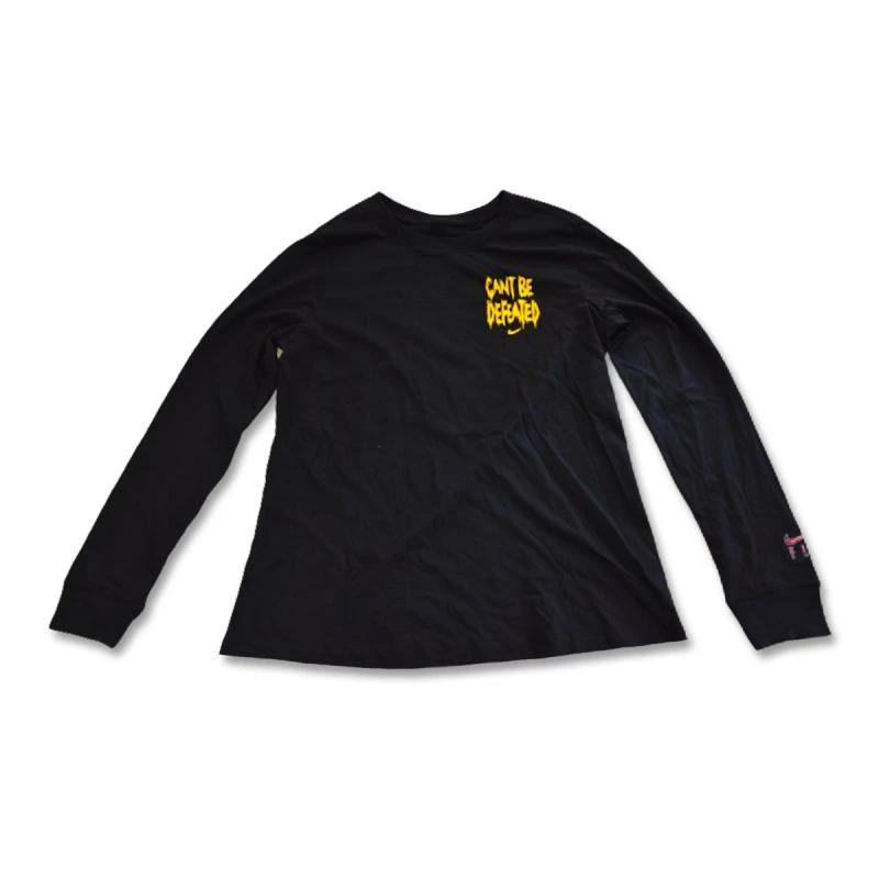 Na přední straně trička je vytištěn inspirativní slogan "Cant be defeated", zatímco na zadní straně je velká barevná grafika.