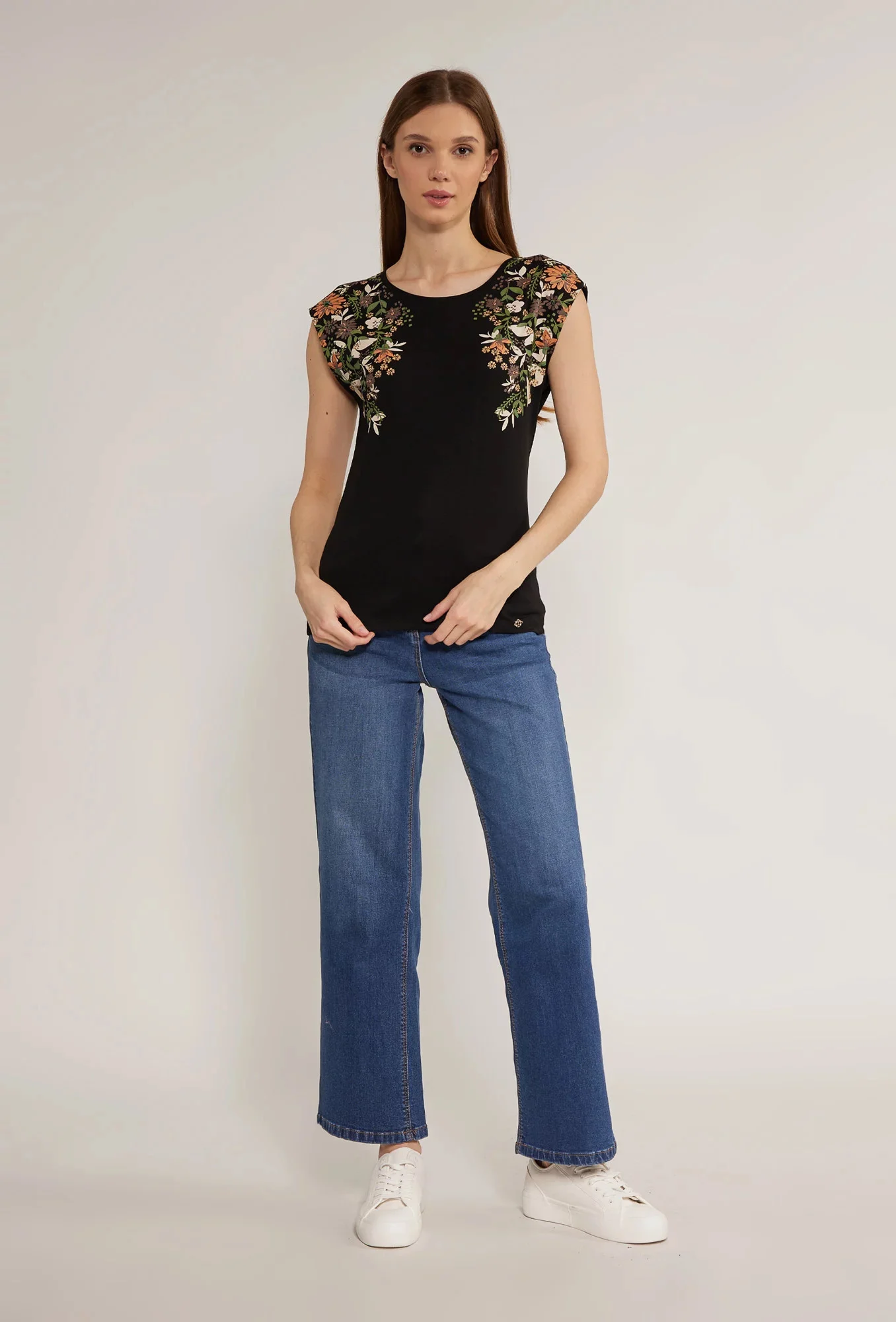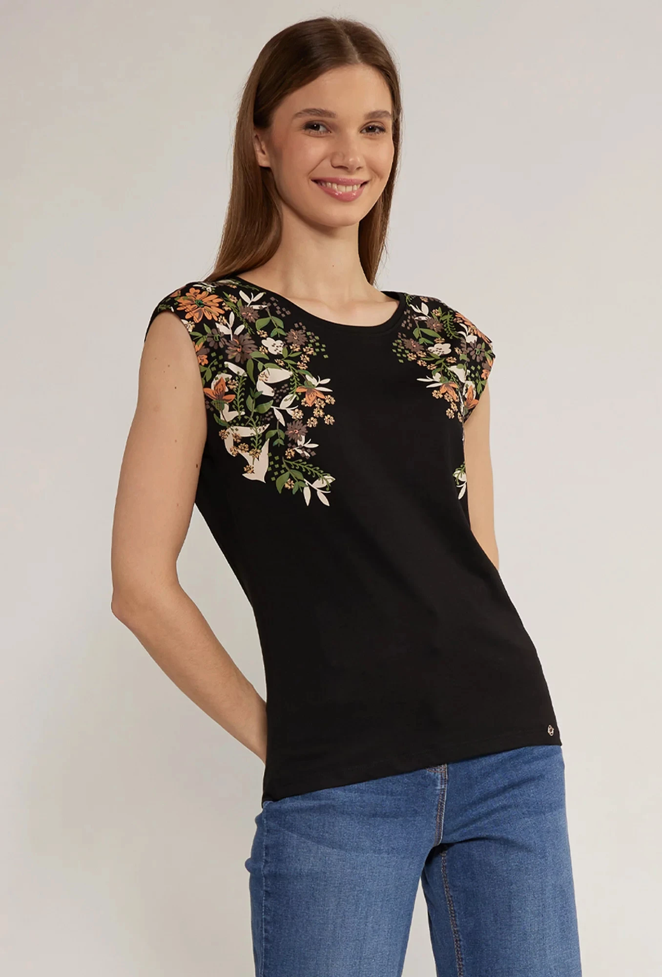 Dámské tričko s květinovým potiskem, bez rukávů a s půlkruhovým výstřihem. Tento model je ideální pro mnoho stylů. Modelka na obrázku je 177 cm vysoká a má velikost 36.