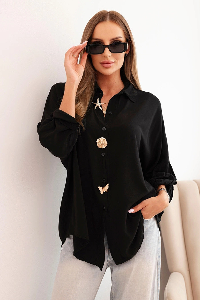 Elegantní dámské tričko z viskózy je skvělým návrhem na každou příležitost – jak na denní nošení, tak do práce. Jemný, příjemný na dotek materiál zajišťuje komfort a volnost pohybu. Klasický límeček dodává celku stylový charakter, a dekorativní knoflíky – včetně motivu hvězdy a motýla – zdůrazňují originální styl.