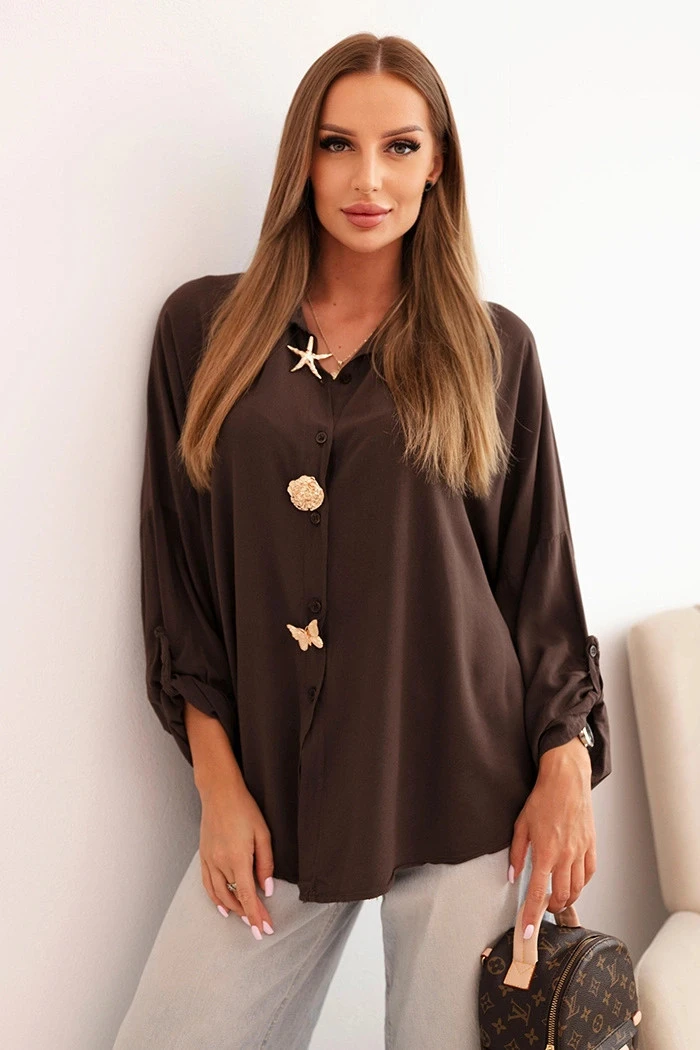 Dámské tričko s model 21954844 ozdobnými knoflíky a límečkem hnědé - K-Fashion