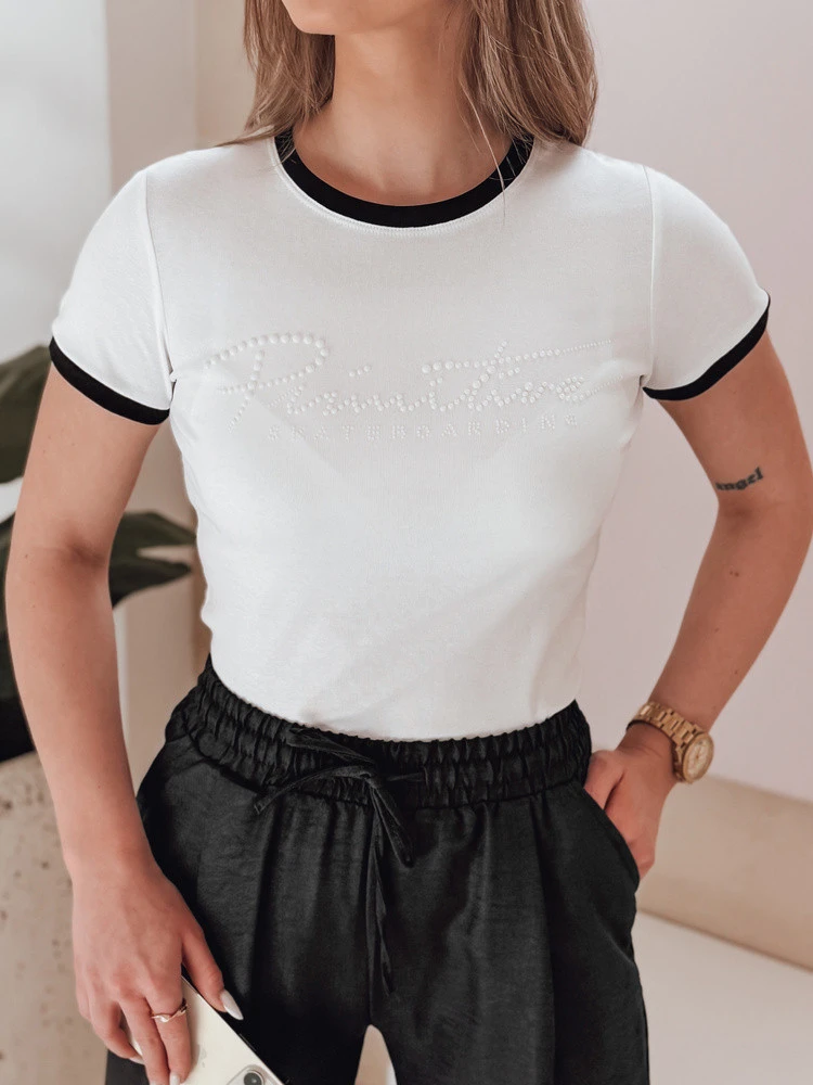 Dámské tričko z jemného úpletu, zakončené kulatým výstřihem a krátkými rukávy s kontrastními lemy. Na přední straně potisk v podobě nápisu z matných zirkonů, který dodává eleganci a 3D efekt. Ideální do jarních dnů pro ležérní styling nebo na setkání s přáteli.