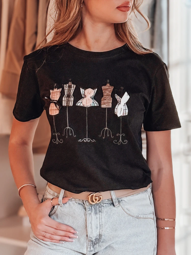 Tričko s okouzlujícím potiskem manekýnek zdobených mašličkami. Našité detaily dodávají tričku 3D efekt a dávají vyniknout stylizaci. Volný střih poskytuje pohodlí a volnost pohybu a klasický základ se hodí k mnoha kompletům. Univerzální volba pro ležérní a poloelegantní stylizaci.