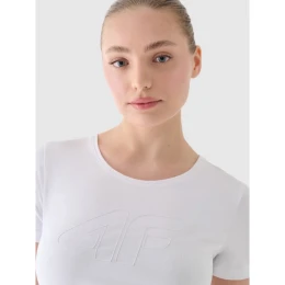 Koszulka z nadrukiem damska dzięki gramaturze 180 gsm jest miękka w dotyku i dobrze się układa. Nie prześwituje oraz zapewnia trwałość i wygodę podczas całorocznego noszenia.T-shirt 4F damski jest wykonany w 95% z bawełny, dzięki czemu jest miękki, trwały i przyjemny w dotyku. Dzięki dodatkowi elastanu (5%) jest rozciągliwa i wygodnie układa się na sylwetce. Okrągły dekolt jest zakończony lekkim ribowaniem. Z przodu widoczny nadruk "4F".