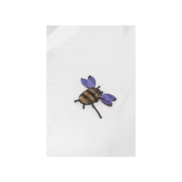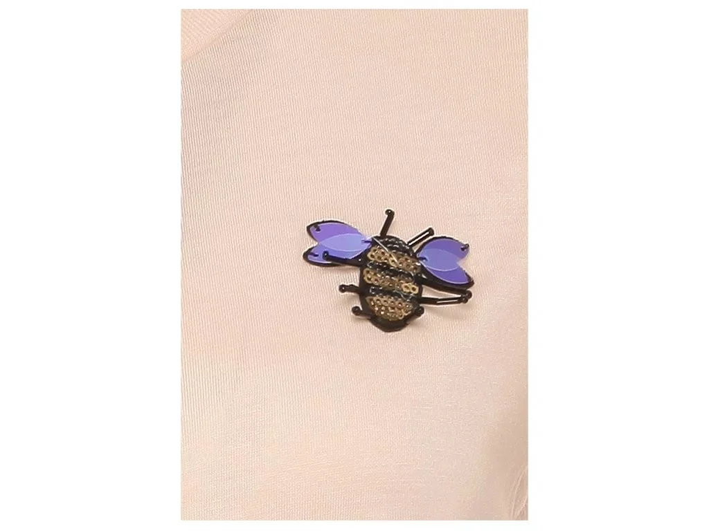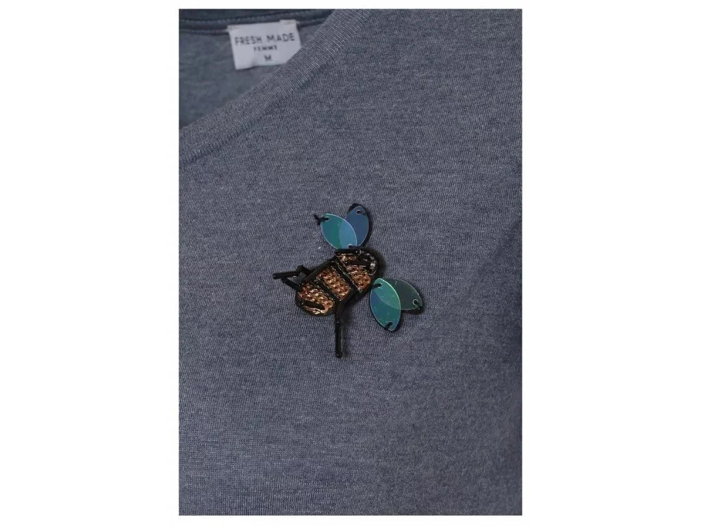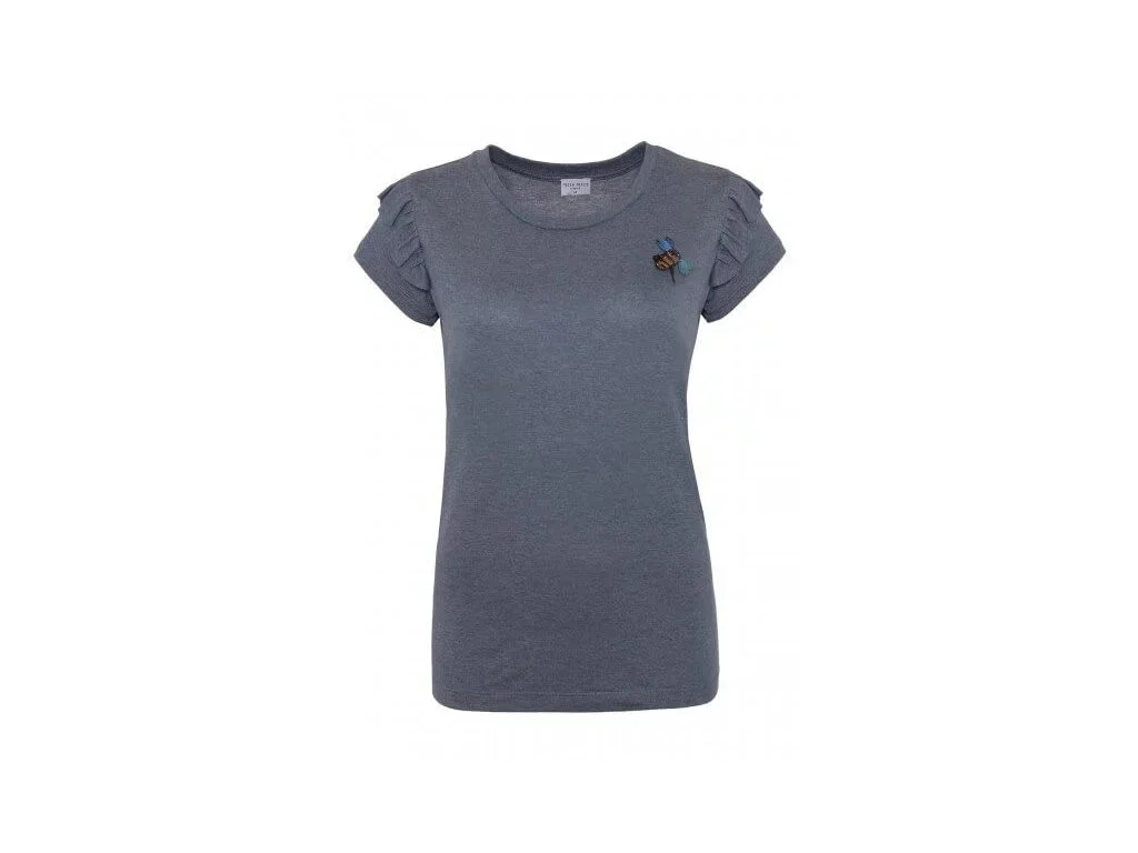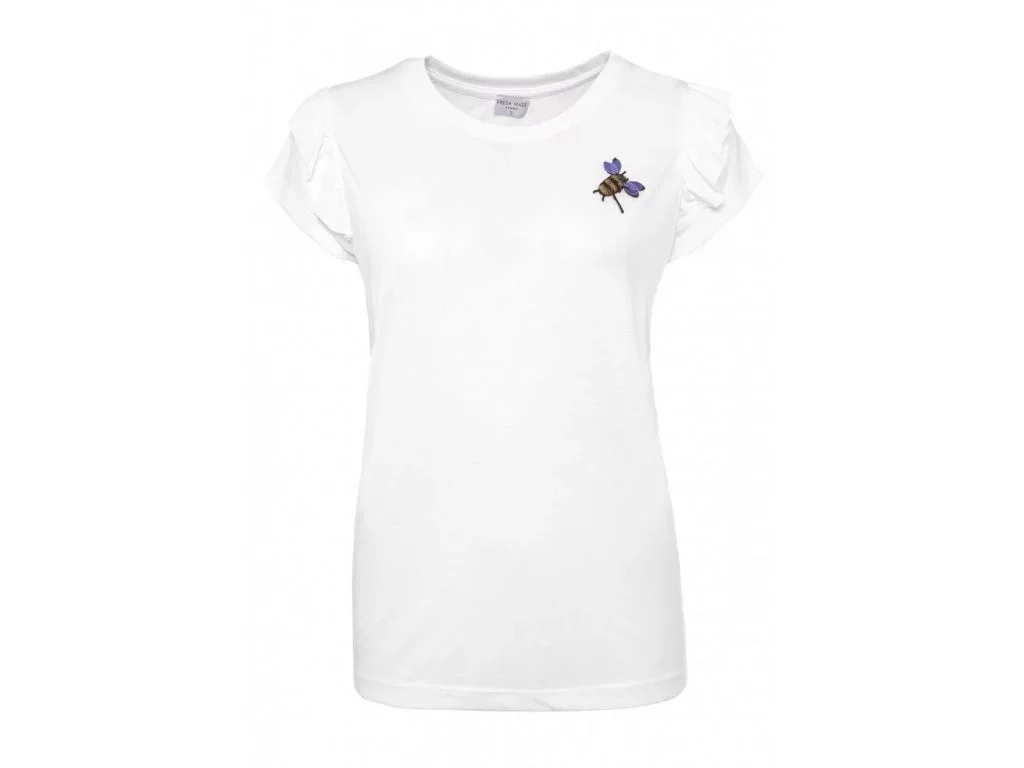 - dámské tričko s volánky, které na hrudi zdobí ozdoba s motivem včely vyrobené z korálků a flitrů,
