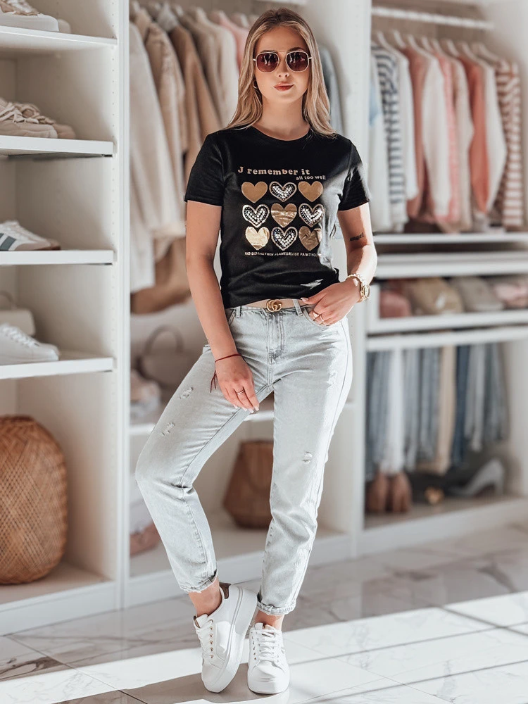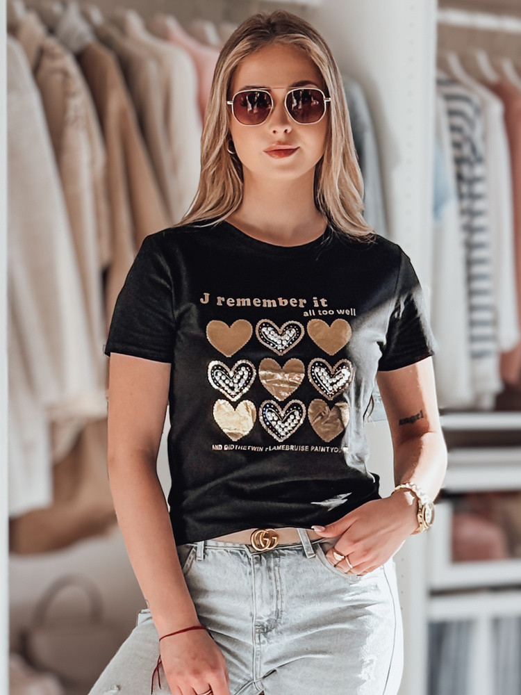 Dámské tričko klasického střihu s jedinečným potiskem srdíček, která jsou zdobena lesklými flitry, perlami a zirkony. Dekorativní ozdoby dodávají tričku elegantní nádech. Ideální volba pro každodenní nošení i jako součást elegantnějších outfitů.