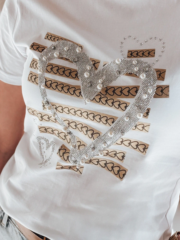 Dámské tričko s krátkým rukávem s poutavým potiskem ve tvaru srdce, obohaceným třpytivými zirkony a perlami pro jedinečný charakter a 3D efekt. Ozdobné prošívání a jemný lesk činí z tohoto modelu dokonalou kombinaci elegance a ležérního stylu. Ideální základ pro každodenní i výraznější outfity.