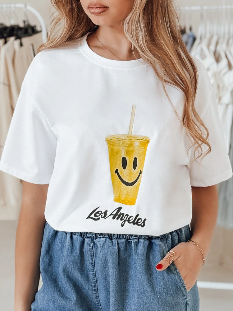 Toto dámské tričko volného střihu s potiskem usměvavého hrnečku a nápisem "Los Angeles" je určeno pro fanoušky městské atmosféry. Příjemný bavlněný materiál je ideální pro teplé dny a módní grafika dodá charakter každému outfitu.