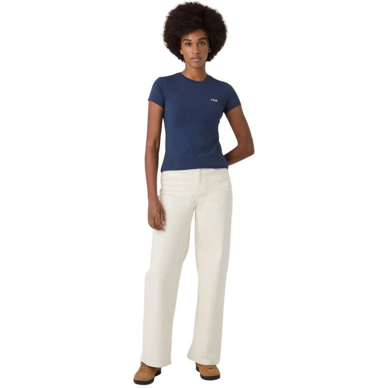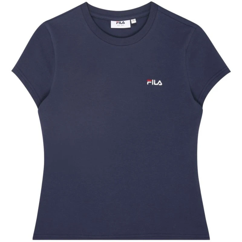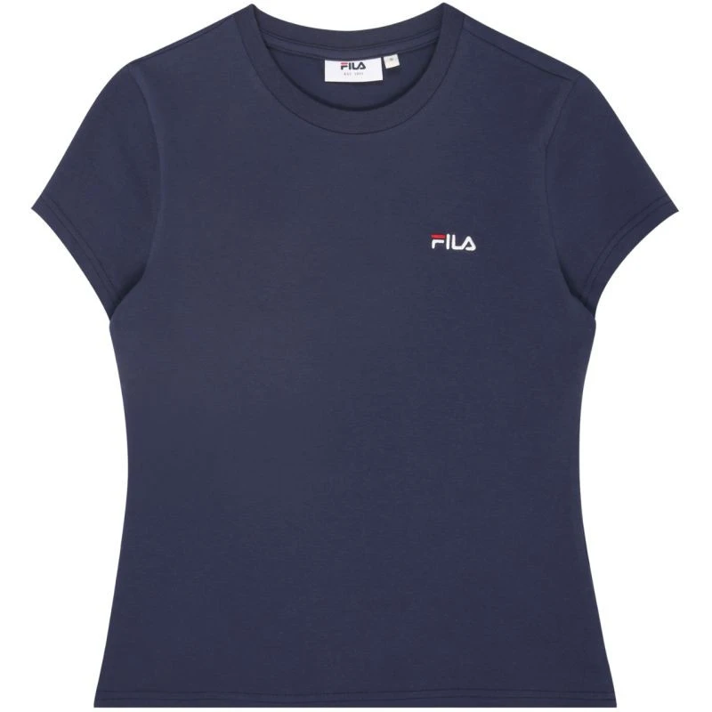 Koszulka damska Fila Trivero granatowa FAW1205 50004 T-shirt damski Fila sprawdzi się na co dzień. Niewielkie, wyszywane logo. Dopasowany, taliowany krój. Miękki materiał. Materiał: 93% bawełna, 7% elastan