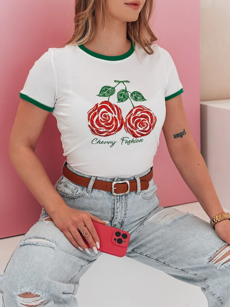 T-shirt damski o dopasowanym kroju z motywem róż ułożonych w kształt wiśni. Cekiny na nadruku subtelnie odbijają światło, nadając całości wyjątkowy charakter oraz efektu 3D. Wykończenie przy rękawkach i dekolcie podkreśla świeży look. Koszulka doskonale sprawdzi się w wiosennych, casualowych outfitach.