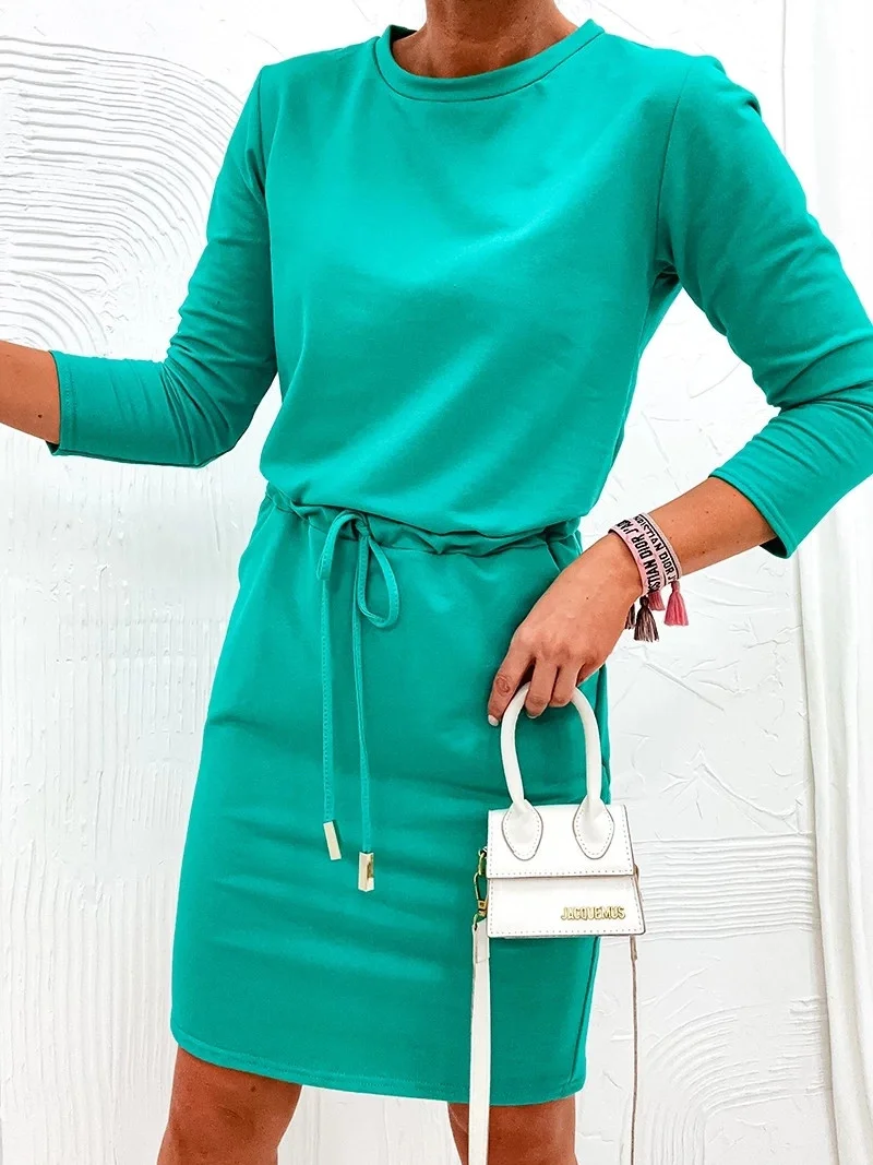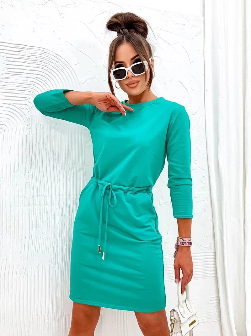Šaty mají kulatý výstřih, 3/4 rukávy a dvě kapsy. V pase modelu je stahující šňůrka.