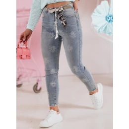 Džínové úzké kalhoty s vysokým pasem, které zvýrazňují siluetu a opticky prodlužují nohy, kombinují eleganci s nádechem půvabu. Zdobí je sedmikrásky a jemné zirkony, dodají jedinečný nádech každému outfitu, mají ozdobné kapsy a zapínání na zip a knoflík. Doplněné páskem pro zvýraznění pasu, nohavice končí před kotníkem a působí stylově. Univerzální a nadčasové, ideální pro ležérní i elegantní styling.