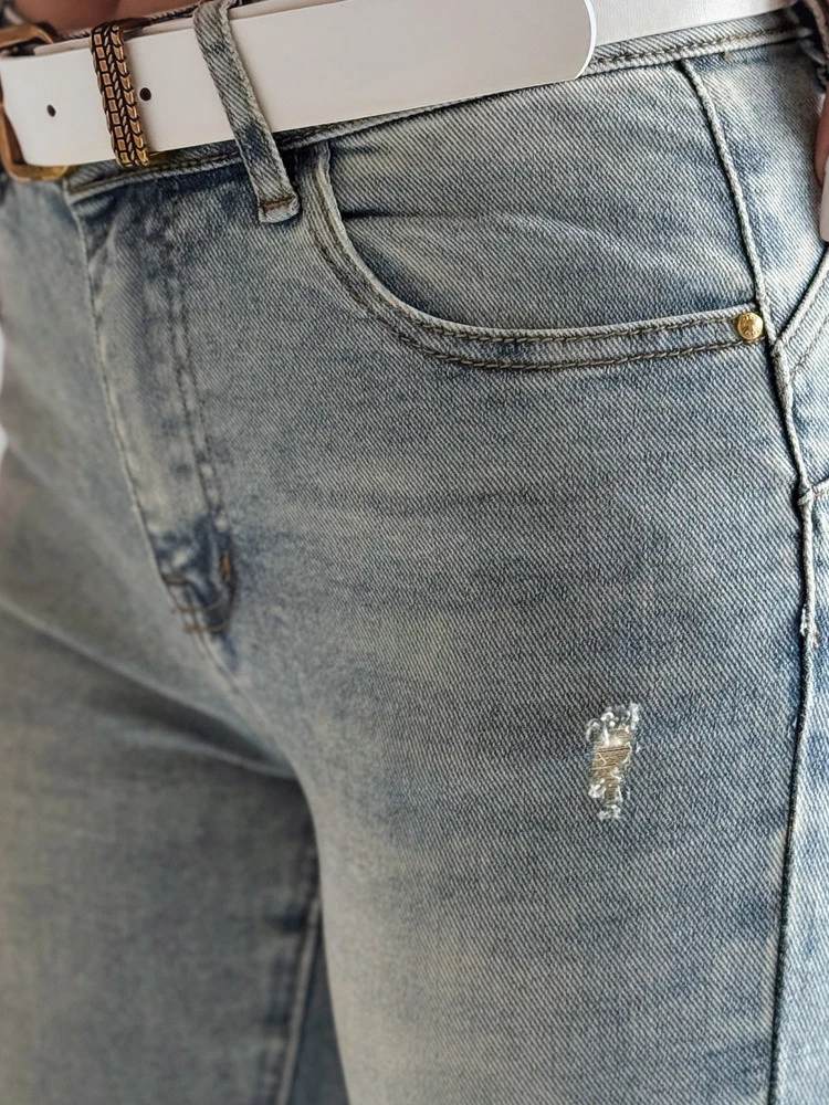 Klasyczne jeansy skinny o średnim stanie, idealne na co dzień. Modne przetarcia i dziury nadają im charakteru, a guziki na końcach nogawek dodają stylowego akcentu. Elastyczny materiał zapewnia komfort noszenia, wąskie nogawki dopasowują się do sylwetki wysmuklając ją. Świetnie komponują się z sneakersami lub eleganckimi butami.
