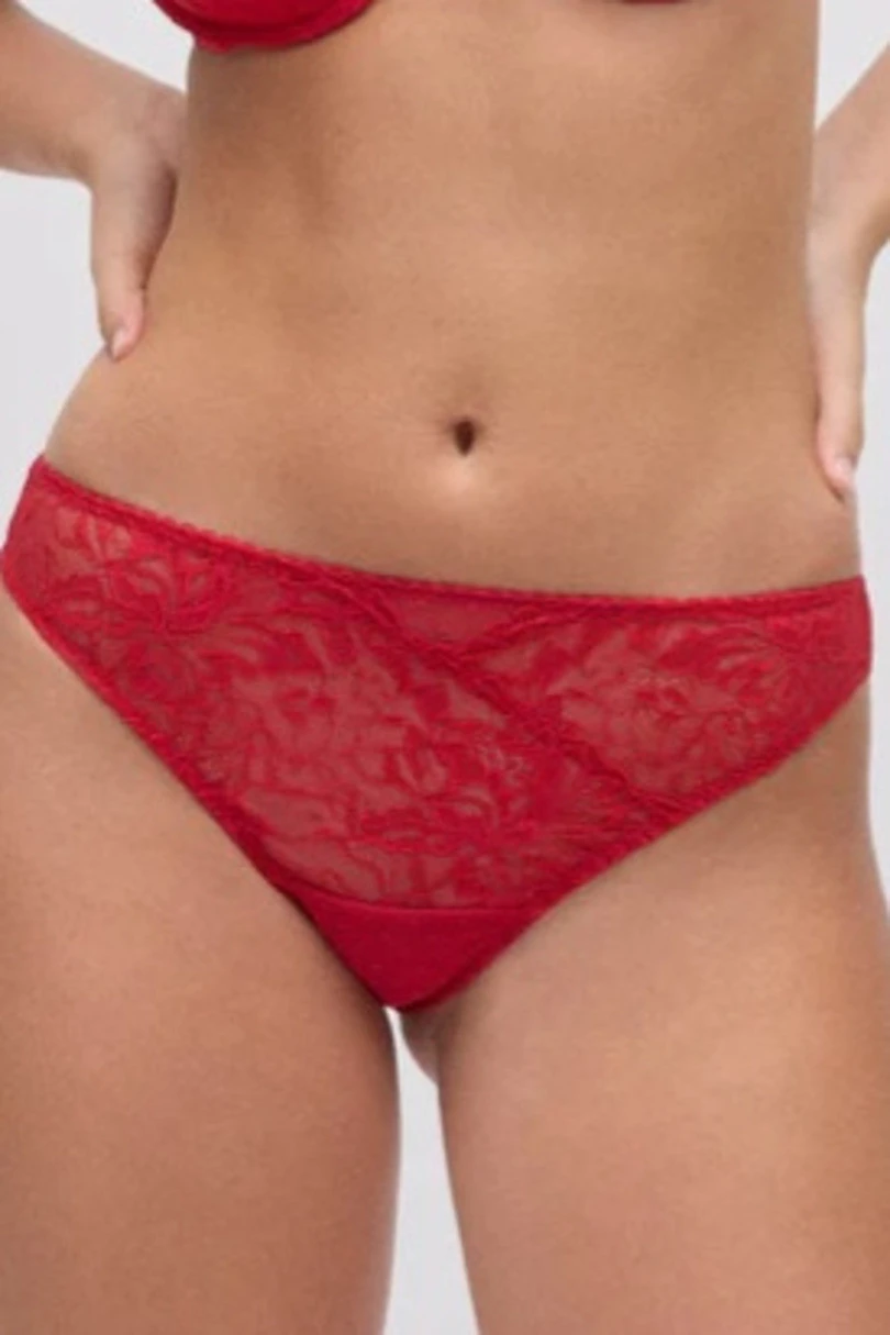 Czerwone brazyliany wykonane z delikatnej, kwiatowej koronki to połączenie elegancji i komfortu. Ich charakterystyczny krój subtelnie eksponuje pośladki, podkreślając kobiece kształty i dodając zmysłowości. Miękka, elastyczna koronka gwarantuje wygodę noszenia, a półprzezroczysty materiał dodaje bieliźnie lekkości i seksapilu. To idealna propozycja zarówno na romantyczne wieczory, jak i jako elegancka bielizna na co dzień. Intensywny czerwony kolor sprawia, że model przyciąga uwagę i podkreśla kobiecość.