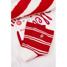 Hřejivé dámské vánoční ponožky v červené barvě s kombinací pruhů a roztomilého motivu medvídka. Vyrobené z měkké směsi s vlnou, která zajišťuje tepelný komfort a příjemný pocit při nošení. Ideální pro zimní období a vánoční atmosféru doma i do bot.