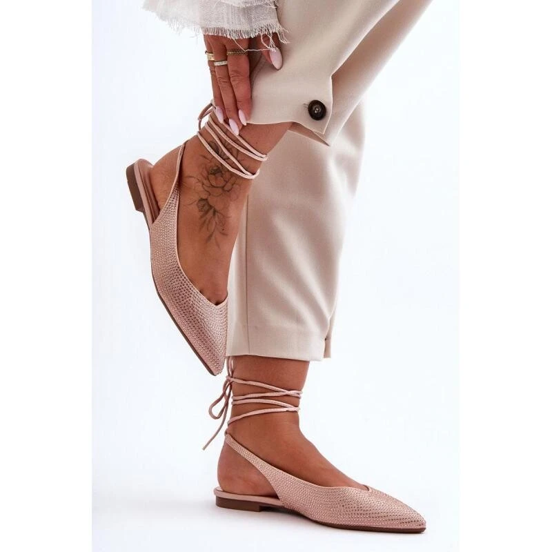 Módní baleríny s otevřenou patou a špičatou špičkou jsou vyrobeny z textilního materiálu. Svršek byl navíc zdoben tryskami. Měkká stélka z ekokůže zajistí pohodlí při používání. Balerínky mají plochý podpatek a zavazování kolem lýtka. Skvělý model pro teplejší dny! Při výběru velikosti se řiďte tabulkou velikostí.