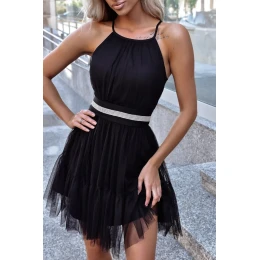 Elegantní síťové šaty s ramínky a nastavitelnou šňůrkou. Šaty se zapínají na skrytý zip. V pase ozdobný pás k zavázání. Spodek lehce rozšířený.
