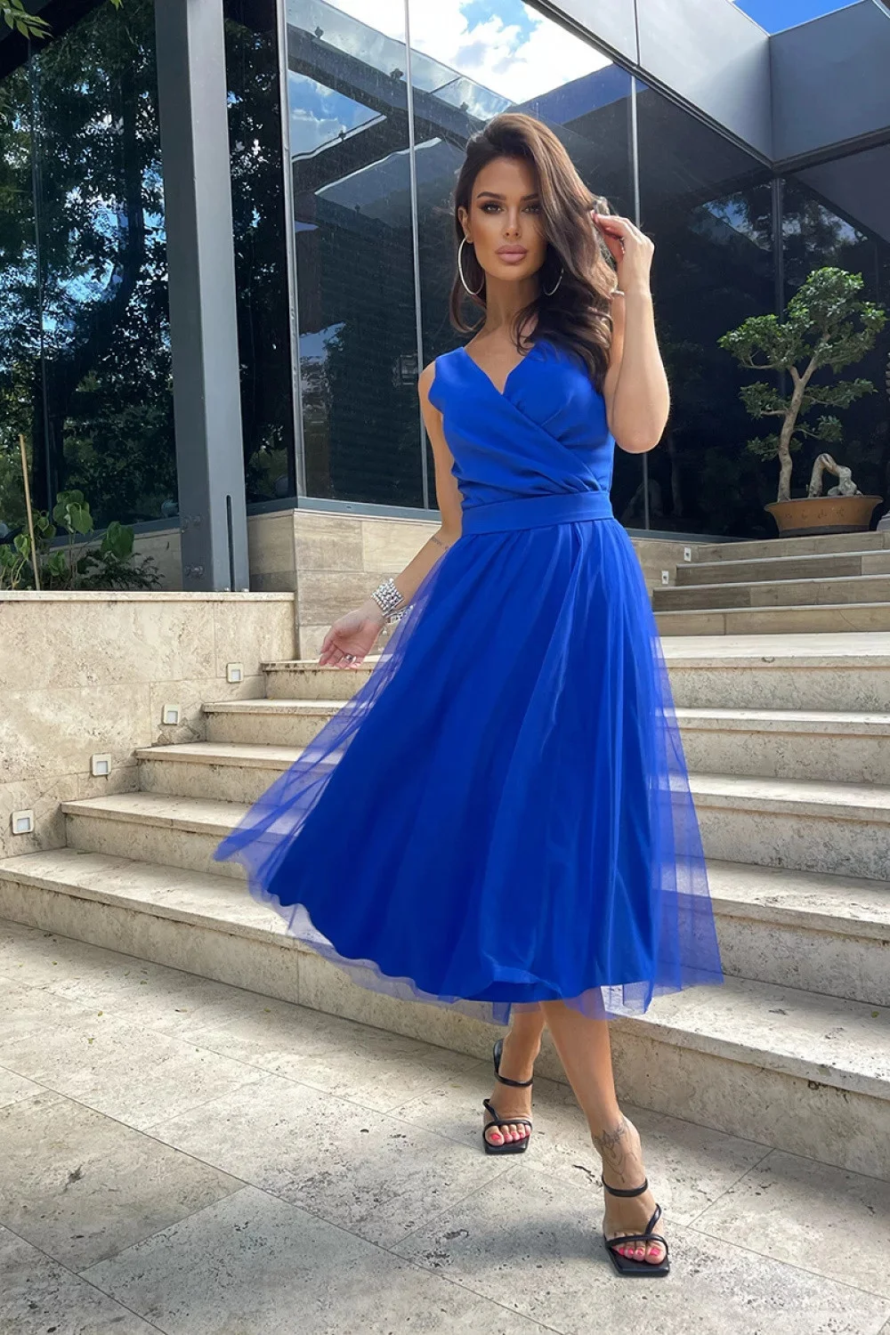 Tylové midi šaty s mírně rozšířenou vrstvenou sukní. Vrchní část výtvoru na silnějších popruzích, dokonale přiléhající k pasu. Ramena a záda jsou odhalená. Model dodávající eleganci a ženskost. Šaty jsou podšité a zapínají se na krytý zip. K dispozici v různých barvách.