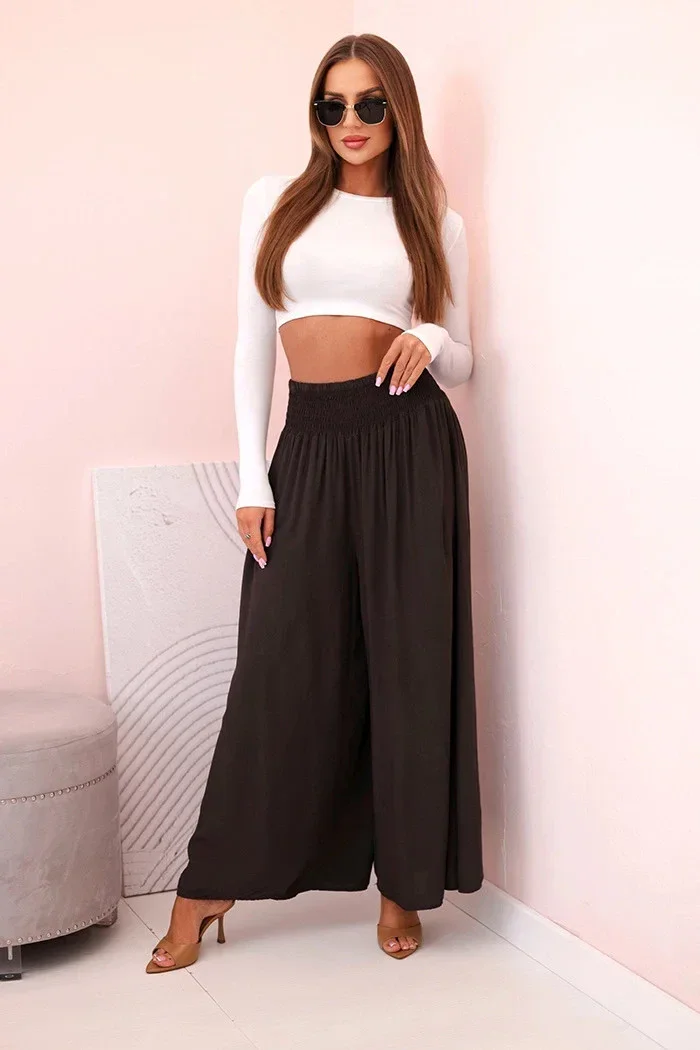 Pokud hledáte pohodlné a stylové kalhoty na každý den nebo na dovolenou, tyto dámské palazzo kalhoty jsou trefou do černého! Vyrobené ze 100% lehké, vzdušné viskózy poskytují nejen komfort při nošení, ale také krásně padnou na postavu. Široké nohavice a rozšířený střih dodávají každému pohybu lehkost a eleganci a elastický pas se skvěle přizpůsobí pasu. Ideální na procházku, nákupy i na pláž – stačí přidat jednoduchý top a je to! Univerzální model, který by neměl chybět ve vašem šatníku. Velikost je univerzální a hodí se pro ženy velikosti S, M nebo L.