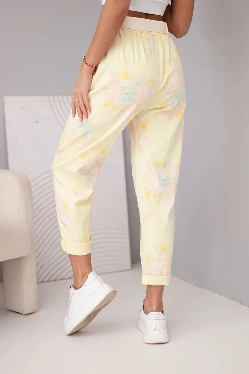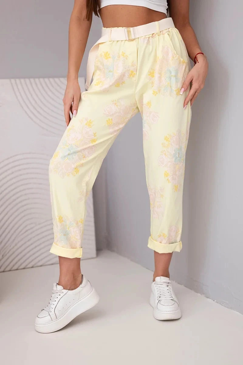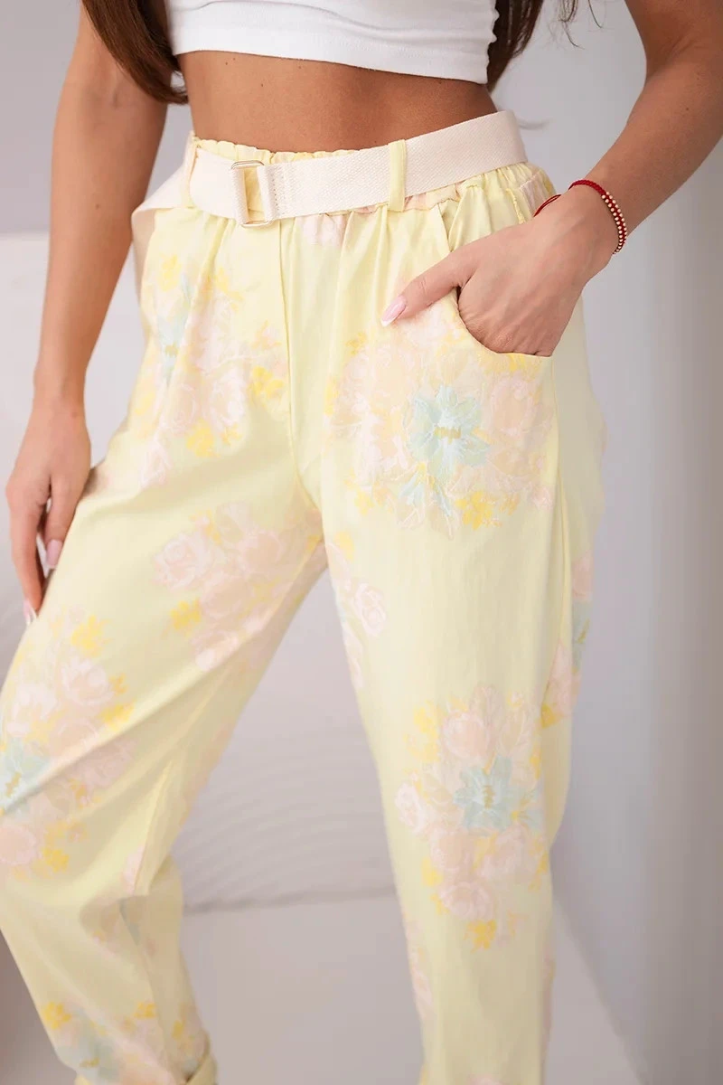 Dámské viskózové kalhoty s květinovým vzorem a páskem žluté